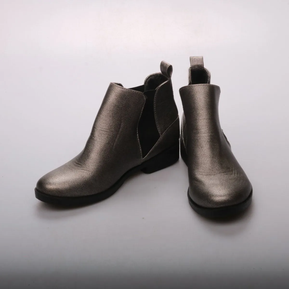Женские ботильоны металлического серебристого цвета с эластичными боковыми вставками и низким устойчивым каблуком. Подойдут на каждый день в межсезонье, легко сочетаются с джинсами и платьями. Практичная резиновая подошва даёт хорошее сцепление и устойчивость.