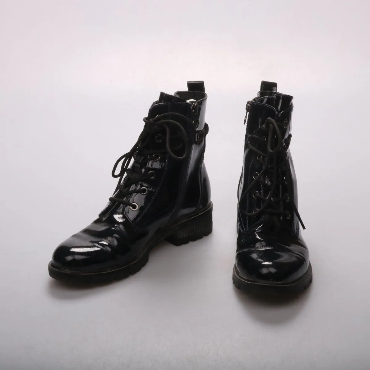 Лакированные ботинки Lamarca чёрного цвета на шнуровке, с боковой молнией и петлёй для удобного надевания. Подойдут для повседневных образов в прохладную погоду и межсезонье. Рельефная подошва даёт более уверенное сцепление на улице.