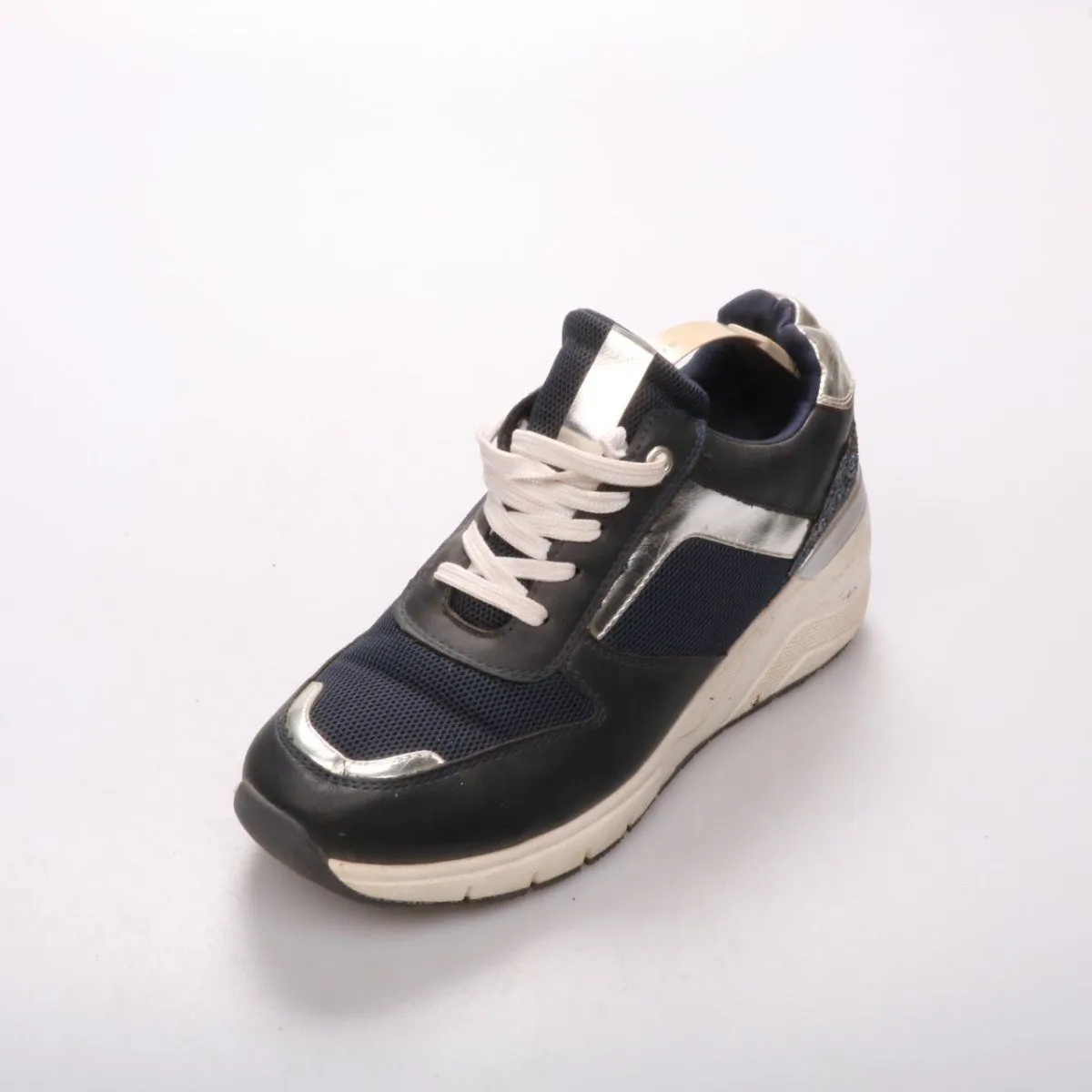 Женские кроссовки Geox в тёмно-синем цвете с серебристыми вставками и комбинированным верхом. Подойдут для прогулок и повседневной носки в межсезонье благодаря удобной колодке и амортизирующей подошве. Дышащие текстильные вставки делают их комфортными при длительной ходьбе.