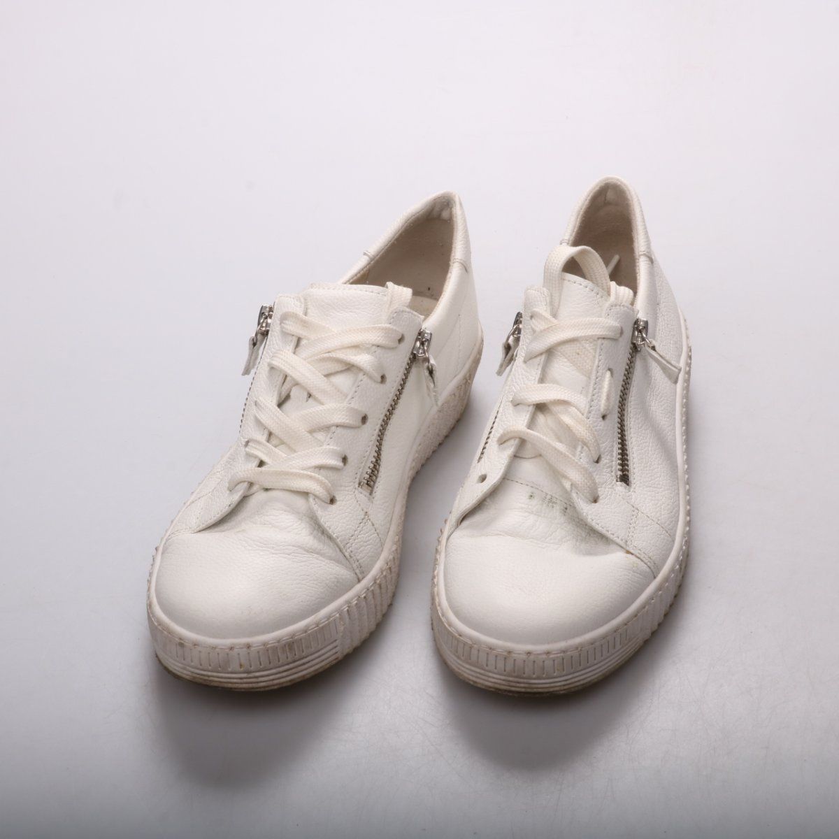 Женские кожаные кроссовки Gabor белого цвета на шнуровке с боковой молнией. Подойдут для повседневной носки в городе и поездок, легко сочетаются с джинсами и платьями. Молния сбоку помогает быстрее надевать и снимать обувь.