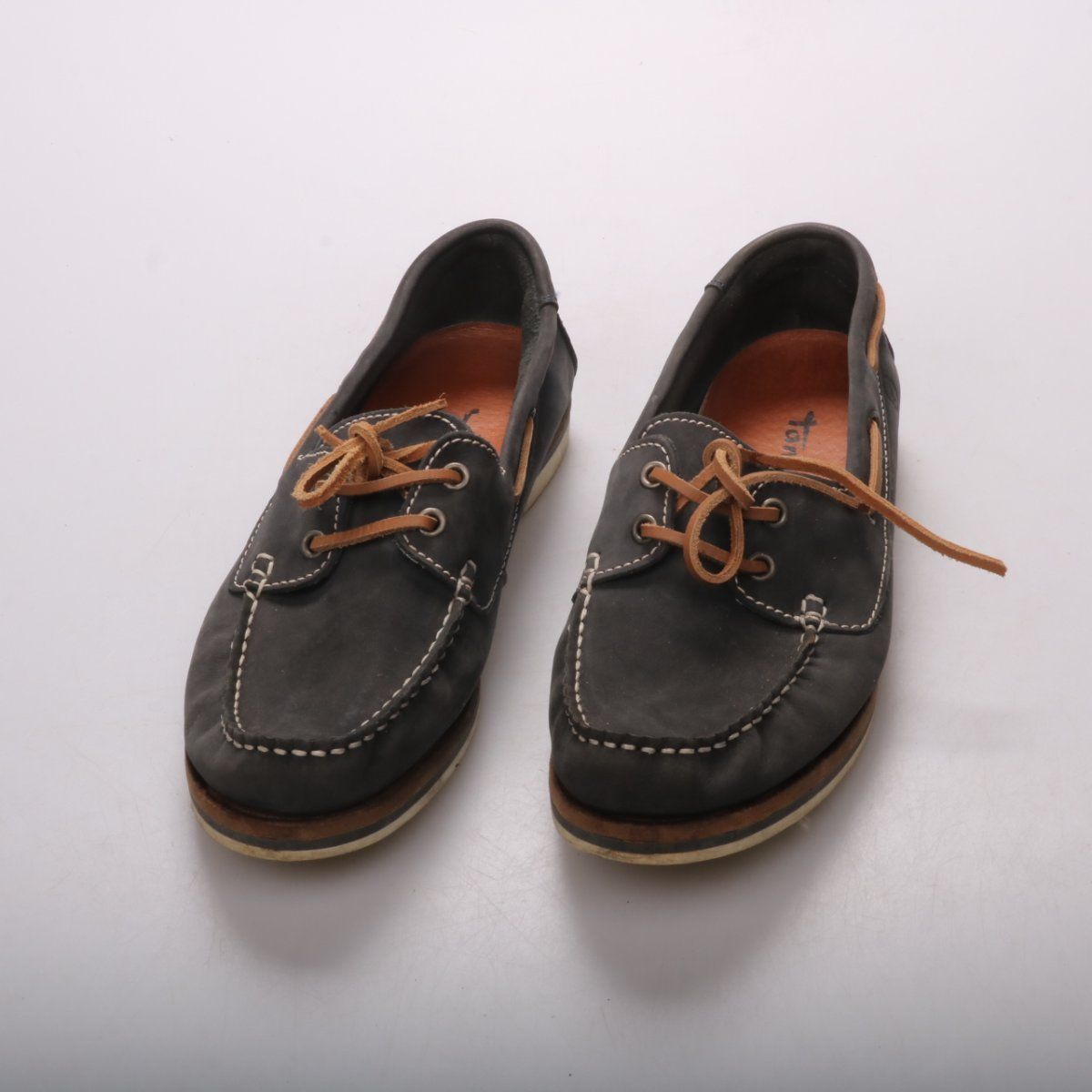 Женские кожаные мокасины Tamaris в стиле топсайдеров: чёрный верх с контрастной прострочкой и коричневыми шнурками. Подойдут для повседневной носки в городе и для поездок в тёплое время года. Лёгкая гибкая подошва удобна для длительной ходьбы.