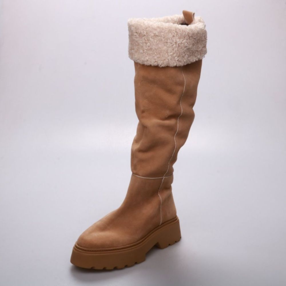 Женские зимние сапоги без указания бренда в светло-коричневом цвете, с меховой оторочкой и массивной рифлёной подошвой. Подойдут для повседневной носки в холодную погоду и прогулок по городу. Платформа и протектор дают устойчивость и лучше держат на ск...