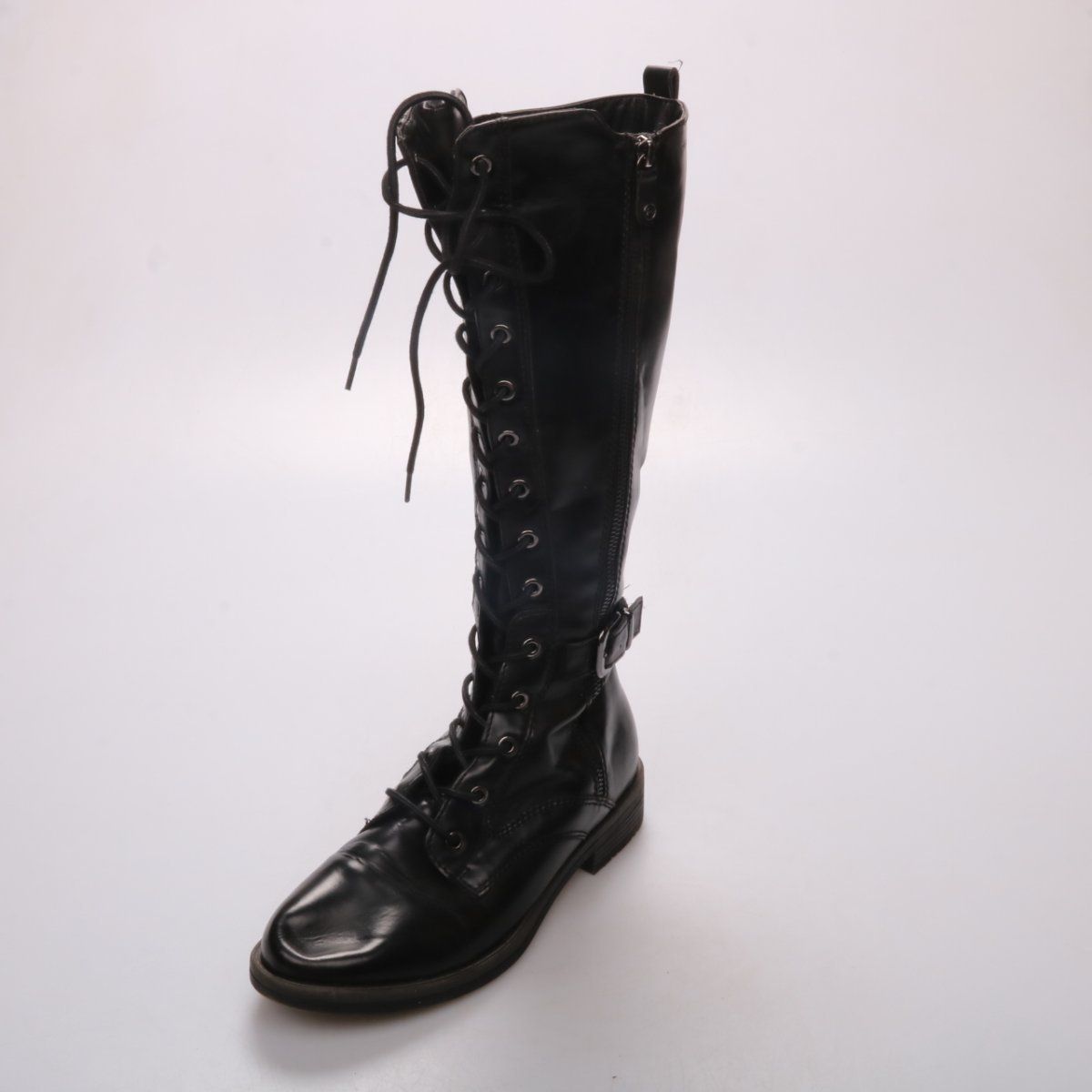 Высокие кожаные сапоги Tamaris чёрного цвета на шнуровке, с боковой молнией и ремешком с пряжкой. Подойдут для повседневной носки в городе в прохладную погоду весной и осенью. Практичное преимущество — молния сбоку помогает быстро надевать и снимать сапоги.