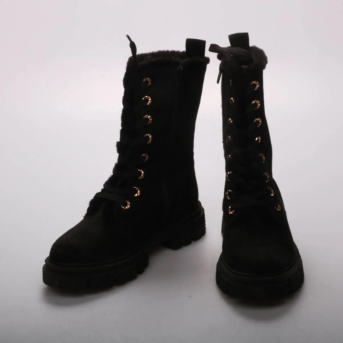 Зимние сапоги Catwalk чёрного цвета из искусственной замши, на шнуровке с боковой молнией и тёплой подкладкой. Подойдут для повседневной носки и прогулок в холодную погоду. Рифлёная массивная подошва помогает увереннее держаться на скользкой дороге.