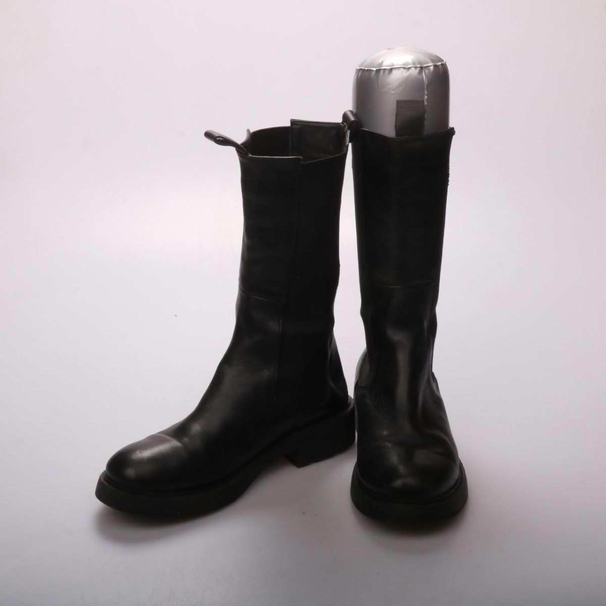 Черные кожаные сапоги без указанного бренда, длина до середины голени и массивная подошва с протектором. Подойдут для повседневной носки в межсезонье и прохладную погоду. Практичное преимущество — петли на голенище помогают быстрее надевать обувь.