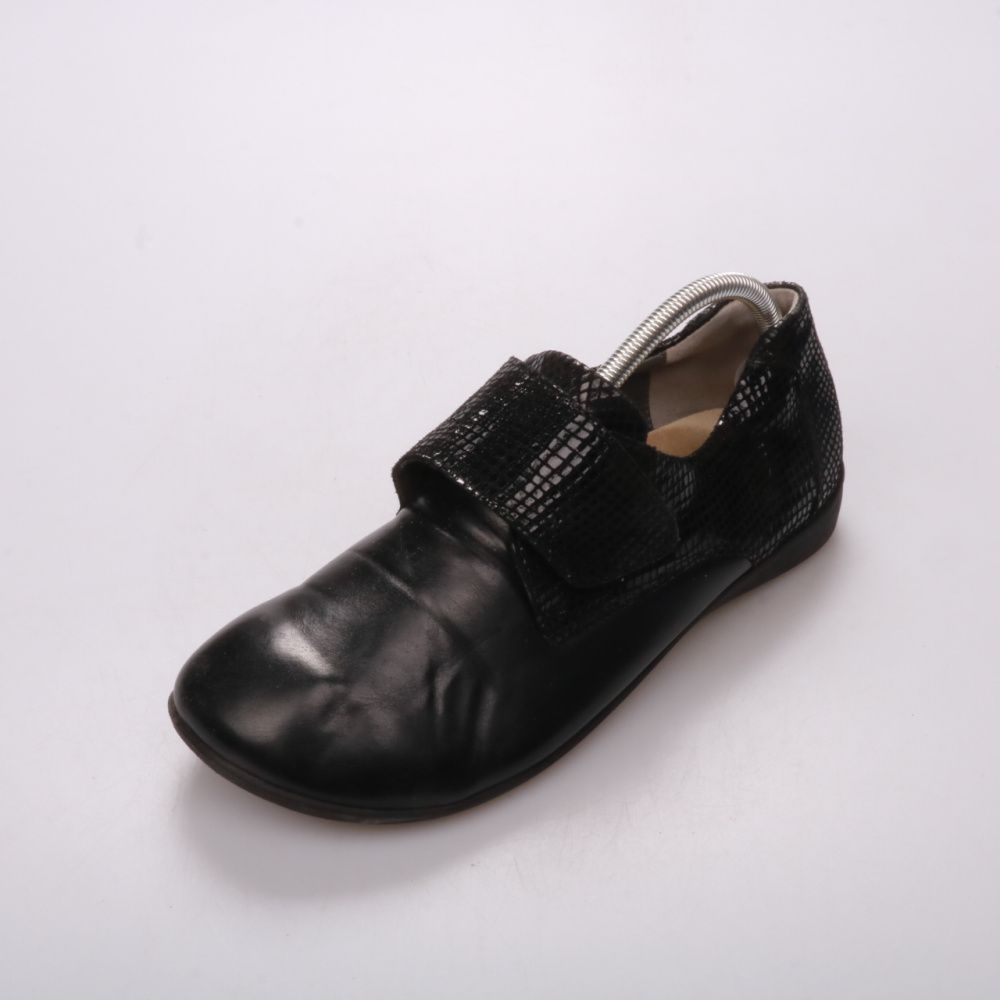 Женские туфли Helvesko из натуральной кожи чёрного цвета с тиснением под рептилию и застёжкой на липучке. Подойдут для повседневной носки и работы, когда важны комфорт и аккуратный вид. Гибкая подошва и удобная фиксация позволяют быстро обуваться и уве...