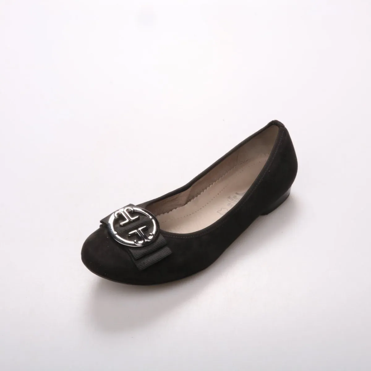 Женские туфли Jenny в чёрном цвете, с низким каблуком и декоративной металлической эмблемой спереди. Подойдут для офиса и повседневных выходов, легко сочетаются с брюками, юбками и платьями. Практичное преимущество — удобная колодка и устойчивая подошва для длительной носки.