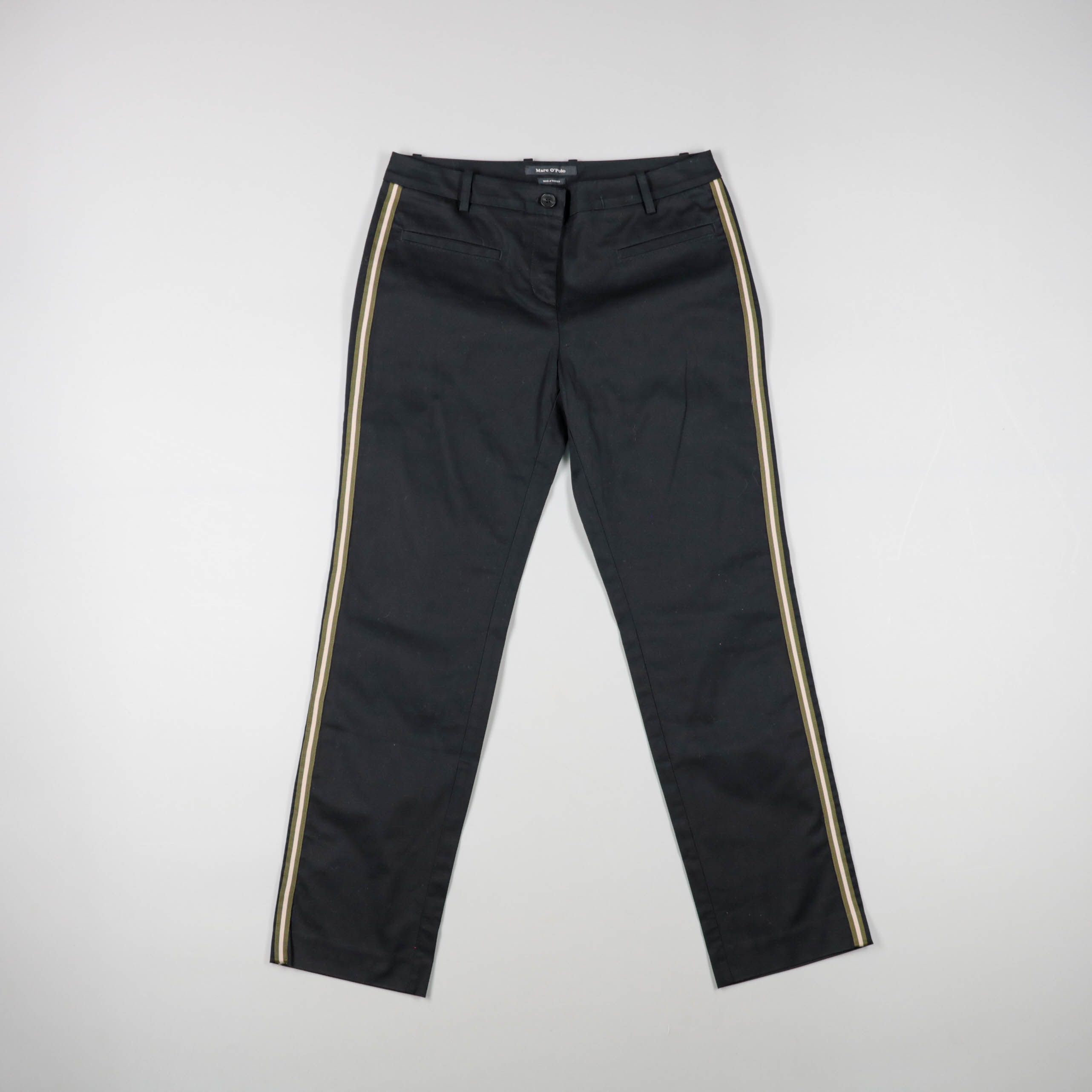 Женские брюки Marc O’Polo прямого кроя, чёрного цвета с контрастными лампасами по бокам. Подойдут для офиса и повседневных образов, легко сочетаются с рубашками, свитерами и жакетами. Практичный плюс — плотная ткань держит форму, а боковые полосы визуа...