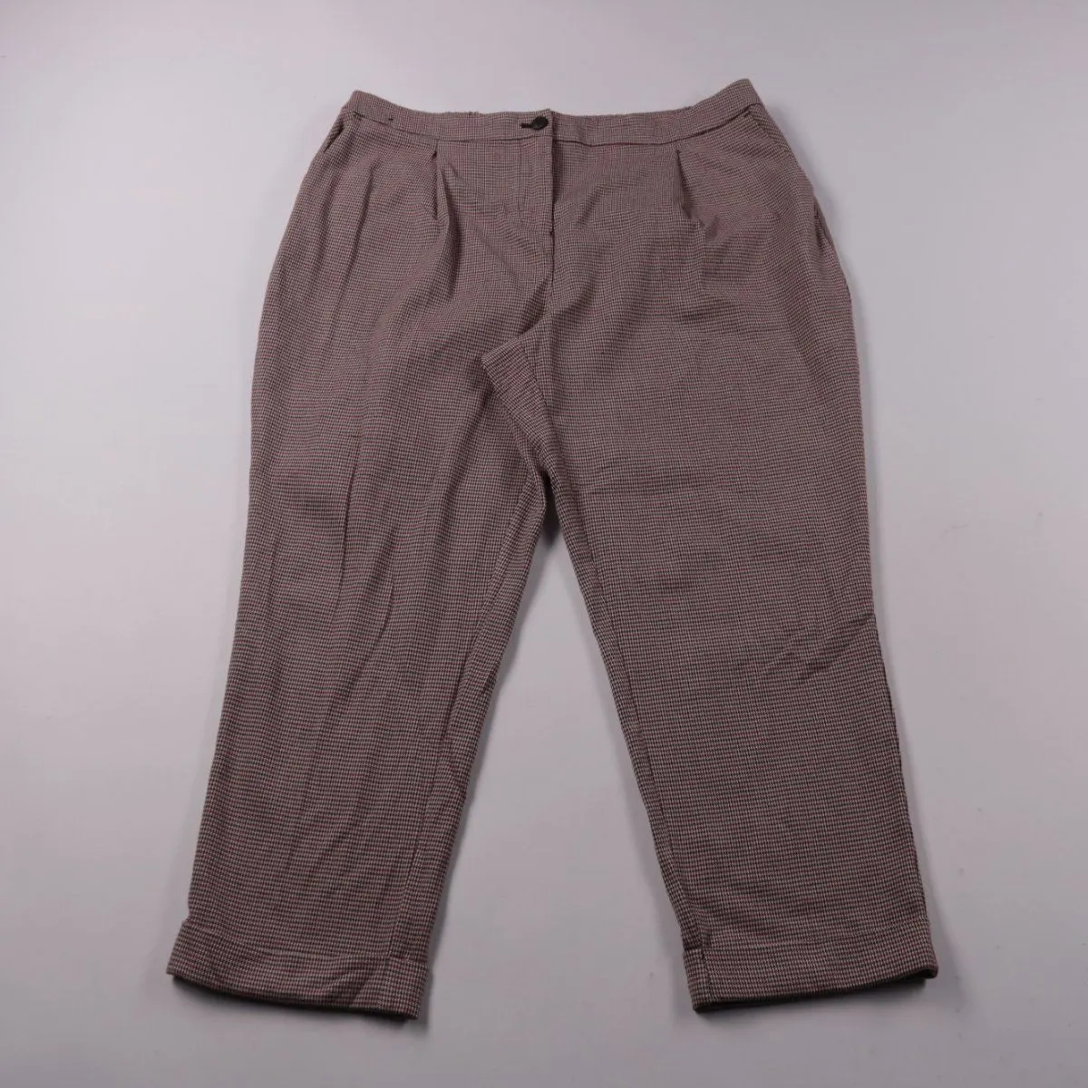 Брюки Next с мелким узором «гусиная лапка» в коричнево-бордовой гамме и классической посадкой. Подойдут для офиса и повседневных образов в демисезон и круглый год. Практичны в носке за счёт смесовой ткани с эластаном, которая меньше мнётся и комфортно тянется.
