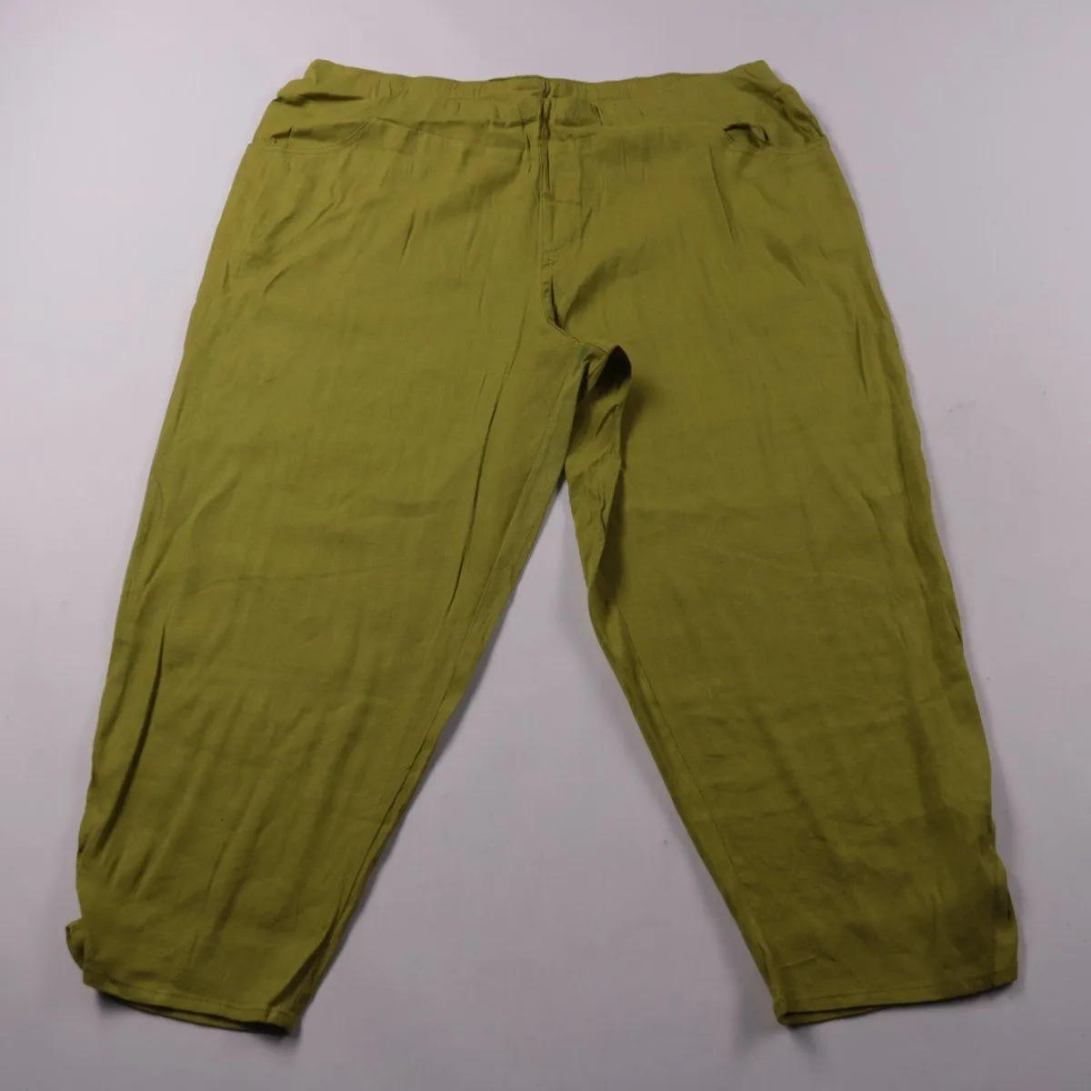 Женские брюки TS оливково-зелёного цвета из льняной смеси, лёгкие и дышащие. Подойдут для тёплой погоды и повседневной носки, крой ближе к прямому с укороченной длиной. За счёт добавления эластана ткань чуть тянется и комфортнее сидит в талии.