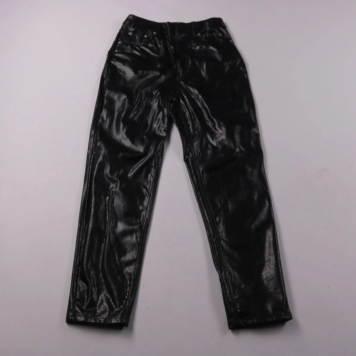 Женские зауженные брюки H&M Divided из материала с глянцевым покрытием под кожу. Подойдут для повседневных городских образов в прохладную погоду и на вечерние выходы. Практичное преимущество — плотная ткань с покрытием меньше продувается и легко протирается от загрязнений.