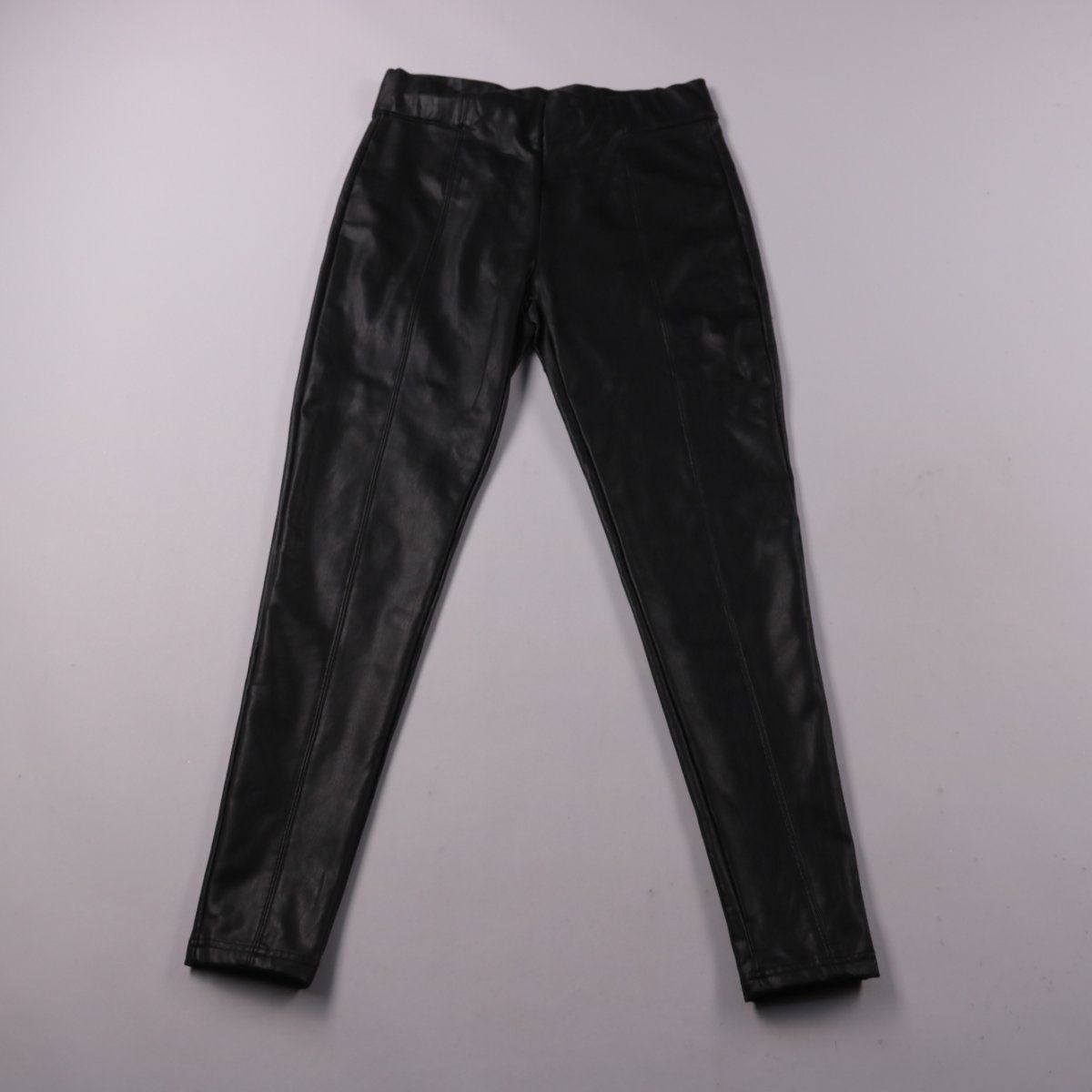 Черные брюки M&S с покрытием под кожу, облегающая модель легинсов и удлинённая посадка по маркировке LONG. Подойдут для повседневных образов в прохладную погоду и хорошо сочетаются с ботинками и высокими сапогами. Практичное преимущество — гладкую поверхность легко протирать от загрязнений.