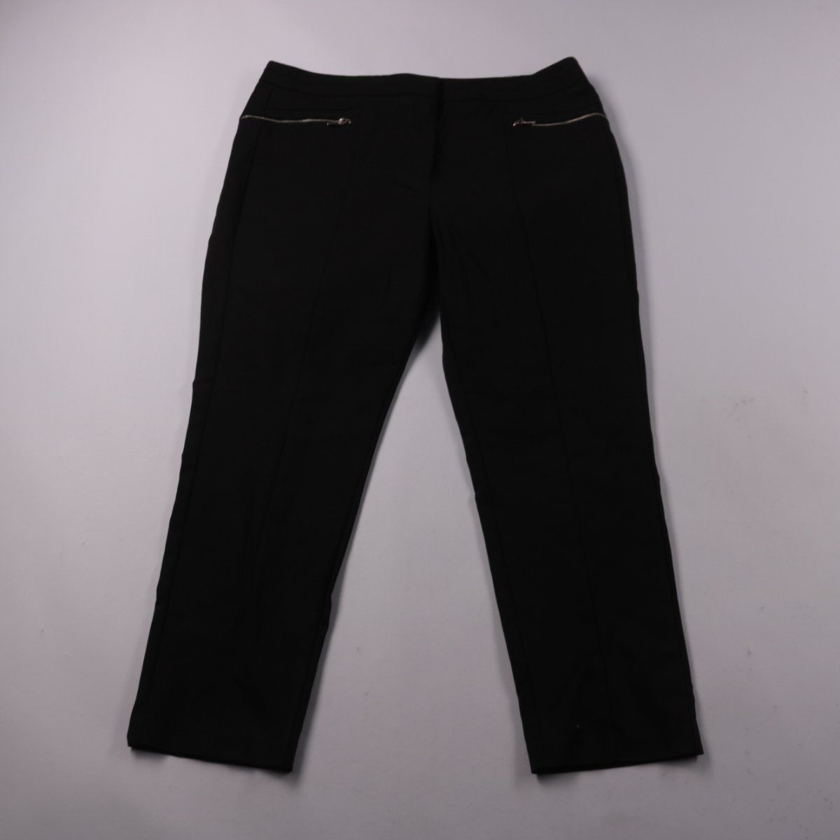 Чёрные женские брюки F&F прямого кроя с аккуратной посадкой и декоративными молниями у карманов. Подойдут для офиса и повседневных образов, легко сочетаются с рубашками и жакетами. За счёт добавления эластана ткань немного тянется и комфортна в носке.