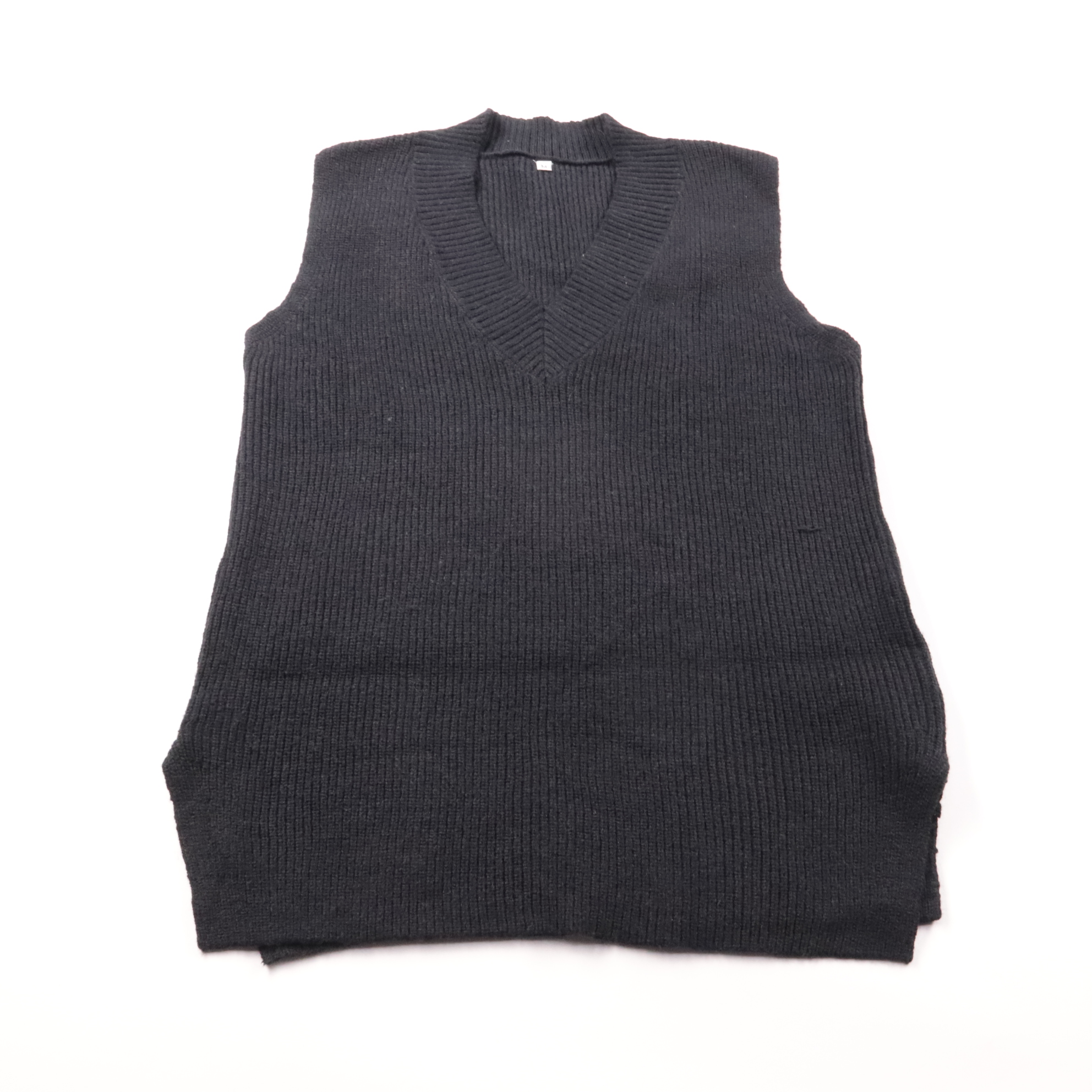 Вязаный жилет без бренда с V-образным вырезом и фактурной резинкой. Подойдёт для многослойных образов с рубашкой или водолазкой в офис и на каждый день. Практичен тем, что не мнётся и легко сочетать с базовыми вещами.