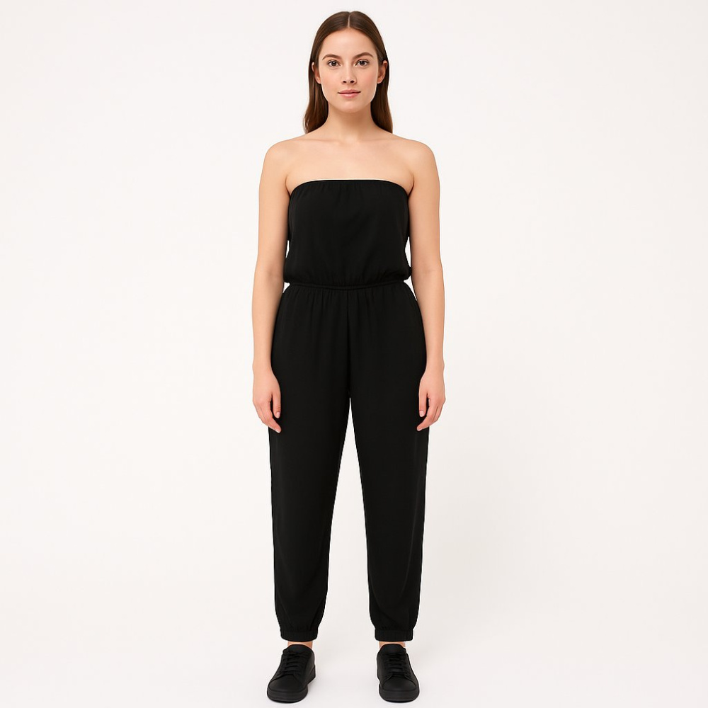 Женский чёрный комбинезон без бретелей с эластичной талией и зауженными брюками. Подойдёт для прогулок, отпуска и повседневных образов с кедами или босоножками. Удобно сидит и быстро надевается благодаря резинке по верху и на талии.