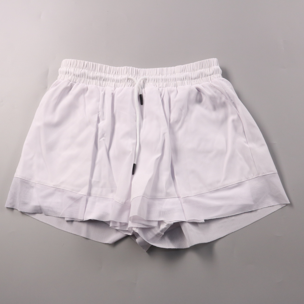 Женские спортивные шорты без указанного бренда, белого цвета, с эластичным поясом на шнурке и свободной посадкой. Подойдут для тренировок, пробежек и отдыха в жаркую погоду. Лёгкий синтетический материал быстро сохнет и комфортно тянется.