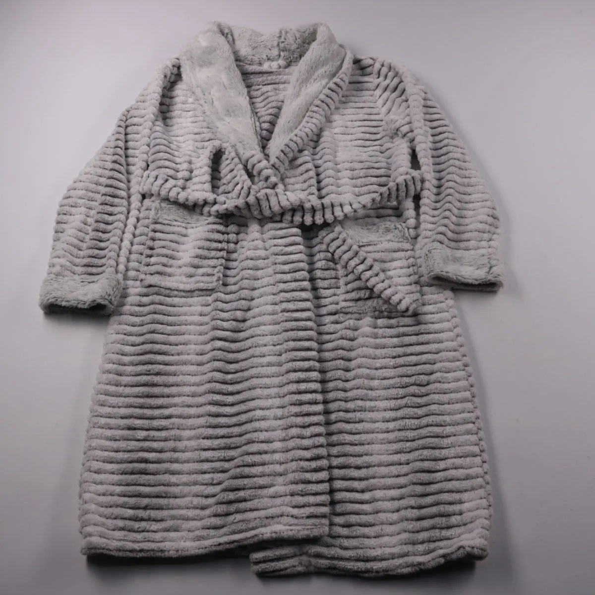 Мягкий домашний халат из пушистого фактурного материала в сером цвете, с воротником шалькой и поясом. Подойдёт для дома, бани или сауны, приятно согревает после душа. Практичный вариант: быстро накидывается и регулируется по талии поясом.
