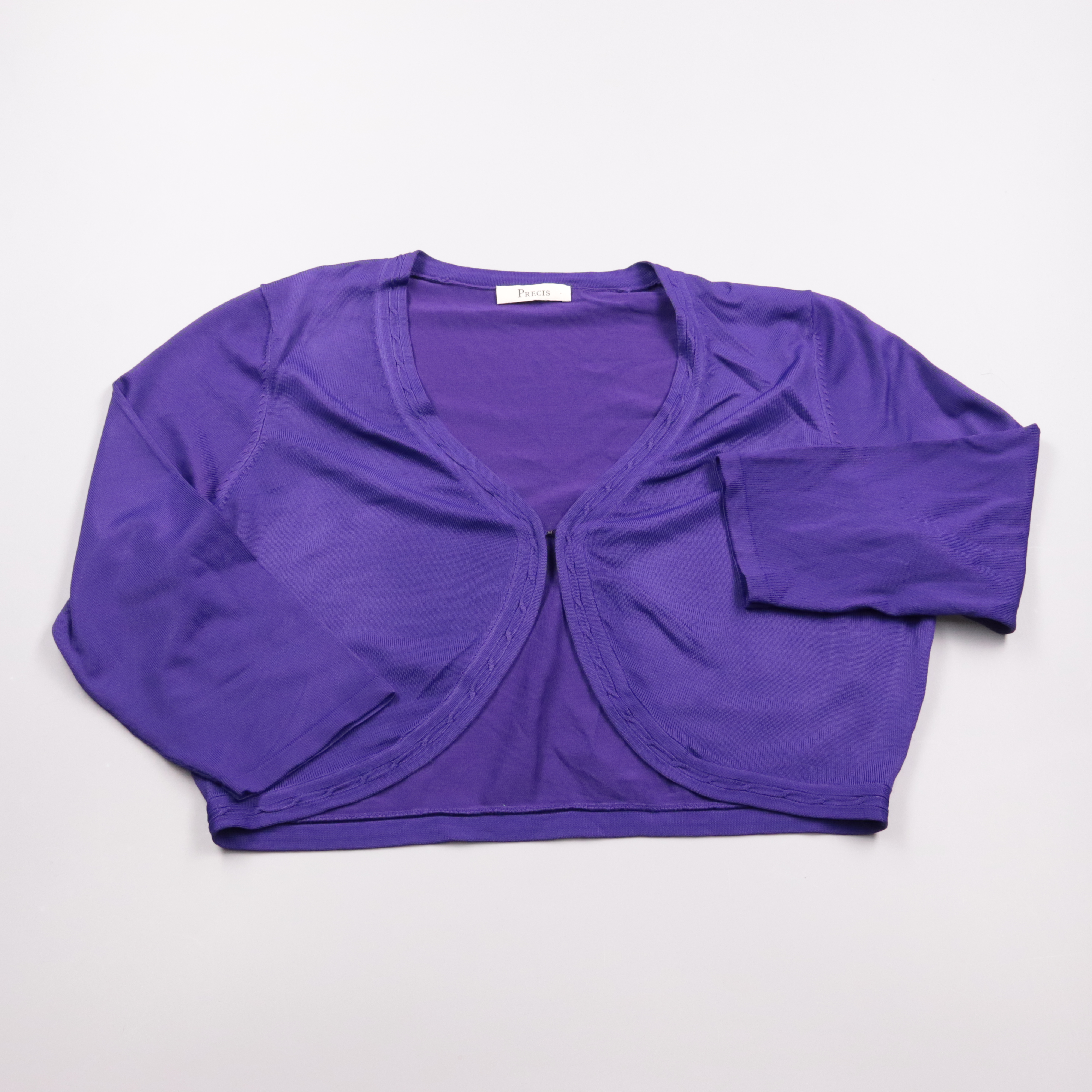 Укороченный кардиган- болеро Precis фиолетового цвета, тонкий трикотаж с длинным рукавом и открытым передом. Подойдёт для офиса и вечерних выходов, чтобы накинуть на платье или топ. Лёгкий и компактный, удобно брать с собой в сумку.