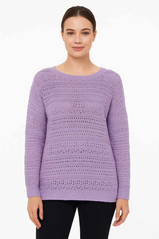 Вязаный ажурный джемпер лавандового цвета с длинным рукавом и круглым вырезом. Подойдёт для повседневных образов в прохладную погоду и удобно носится с топом или майкой из-за перфорации. Состав с акрилом и полиамидом делает вещь лёгкой и простой в уходе.