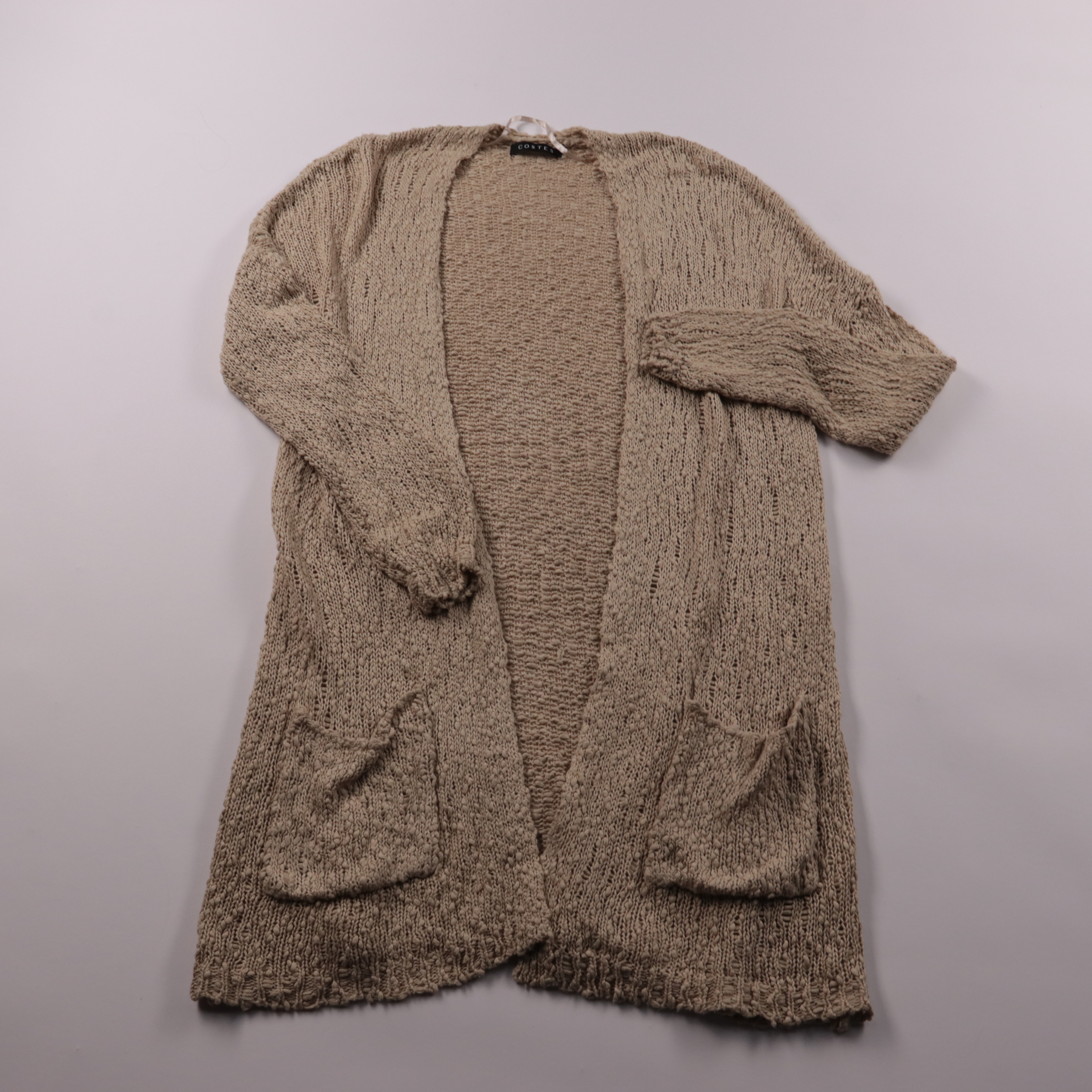 Вязаный кардиган Costes бежевого цвета с открытым передом и двумя накладными карманами. Подойдёт для демисезона и прохладных летних вечеров, удобно надевать поверх топов и платьев. Объёмная вязка хорошо держит тепло и не сковывает движения.