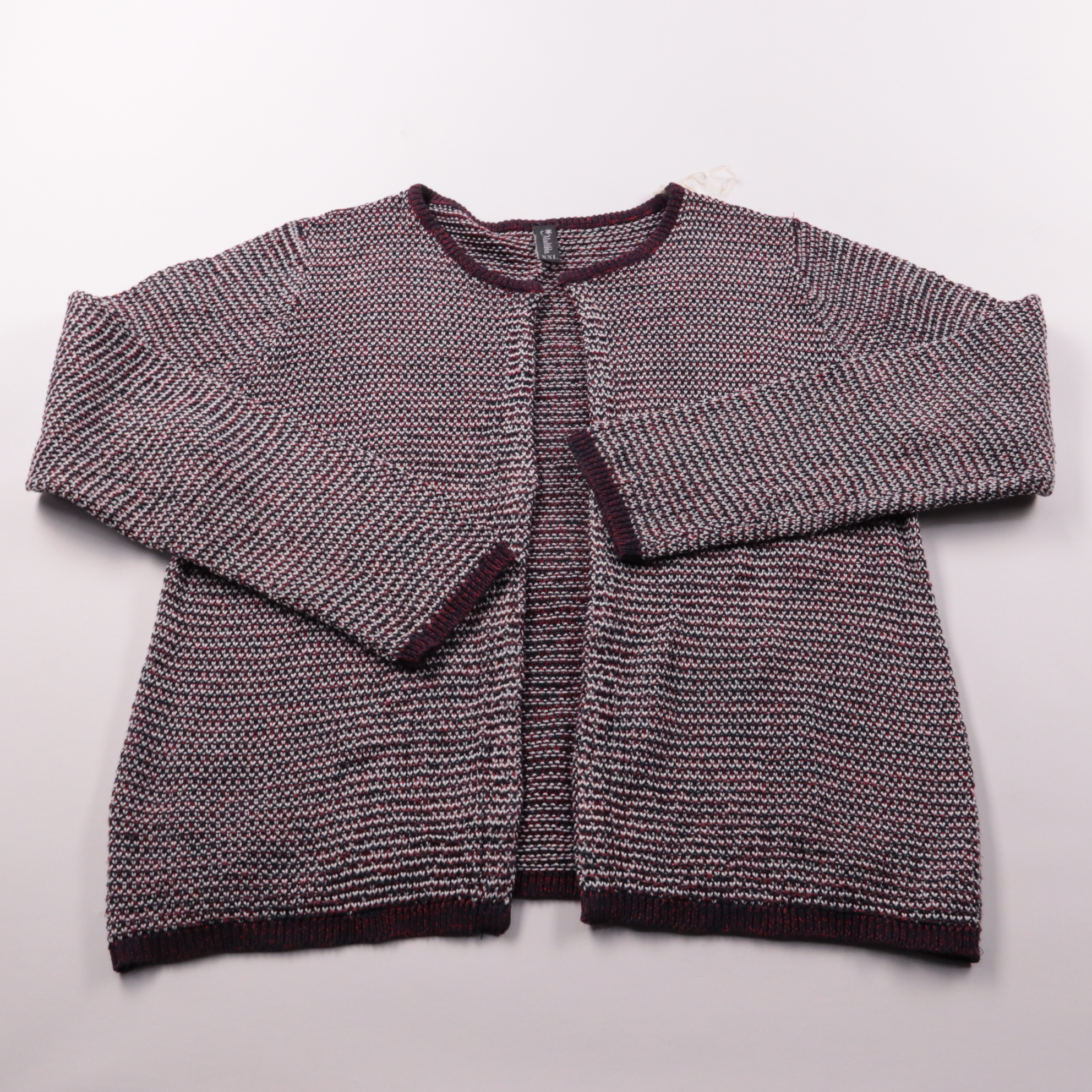 Вязаный кардиган Multiblu в меланжевой расцветке (бордовый/белый/тёмно-синий), прямого кроя с округлой горловиной и без застёжки. Подойдёт для повседневных образов в офис или на прогулку, удобно носить как второй слой поверх топа или блузки. Плотная вя...