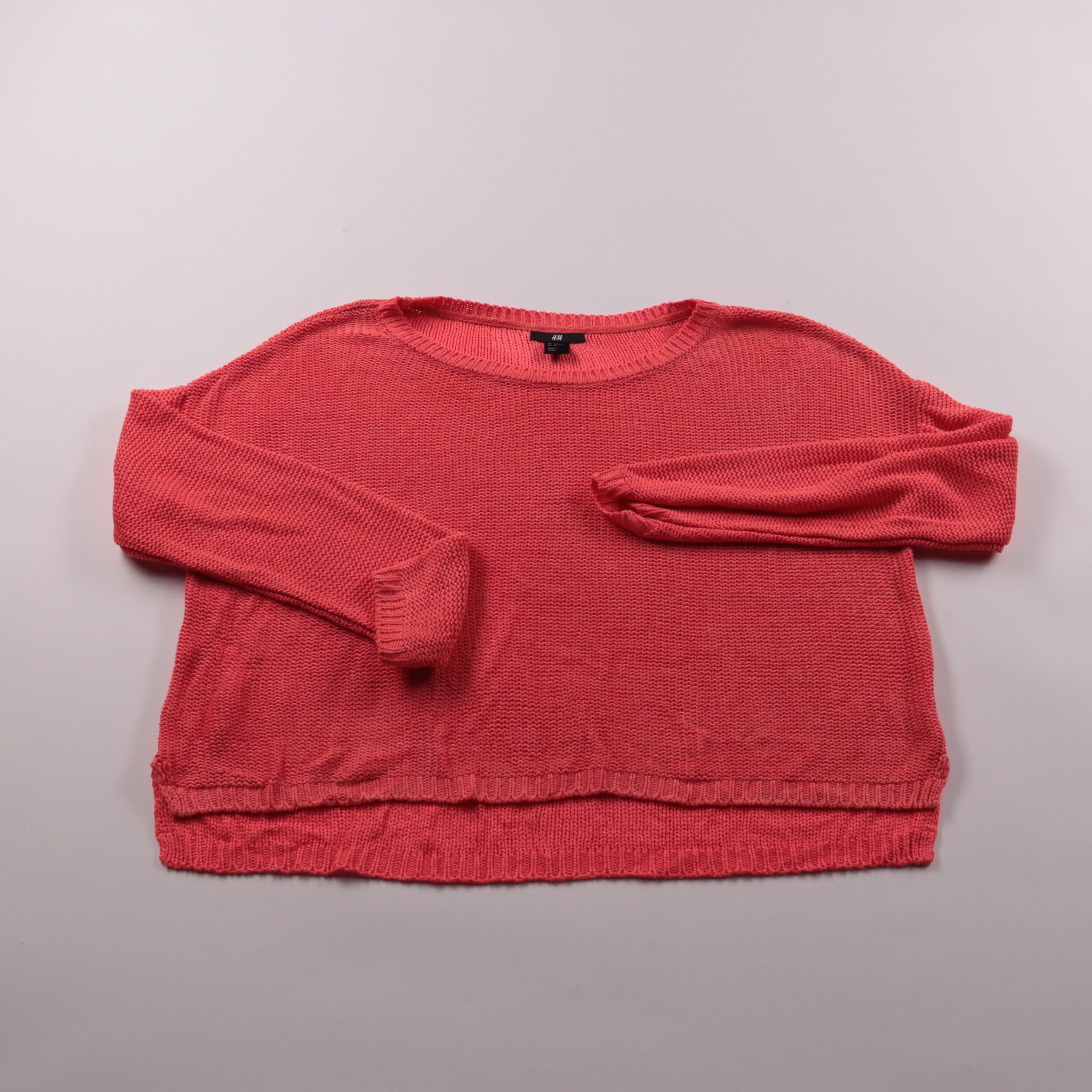 Вязаный джемпер H&M кораллового цвета с круглым вырезом и свободной посадкой. Подойдёт для повседневных образов в прохладную погоду, хорошо сочетается с джинсами и юбками. Мягкая вязка и удобные манжеты делают его комфортным для носки.