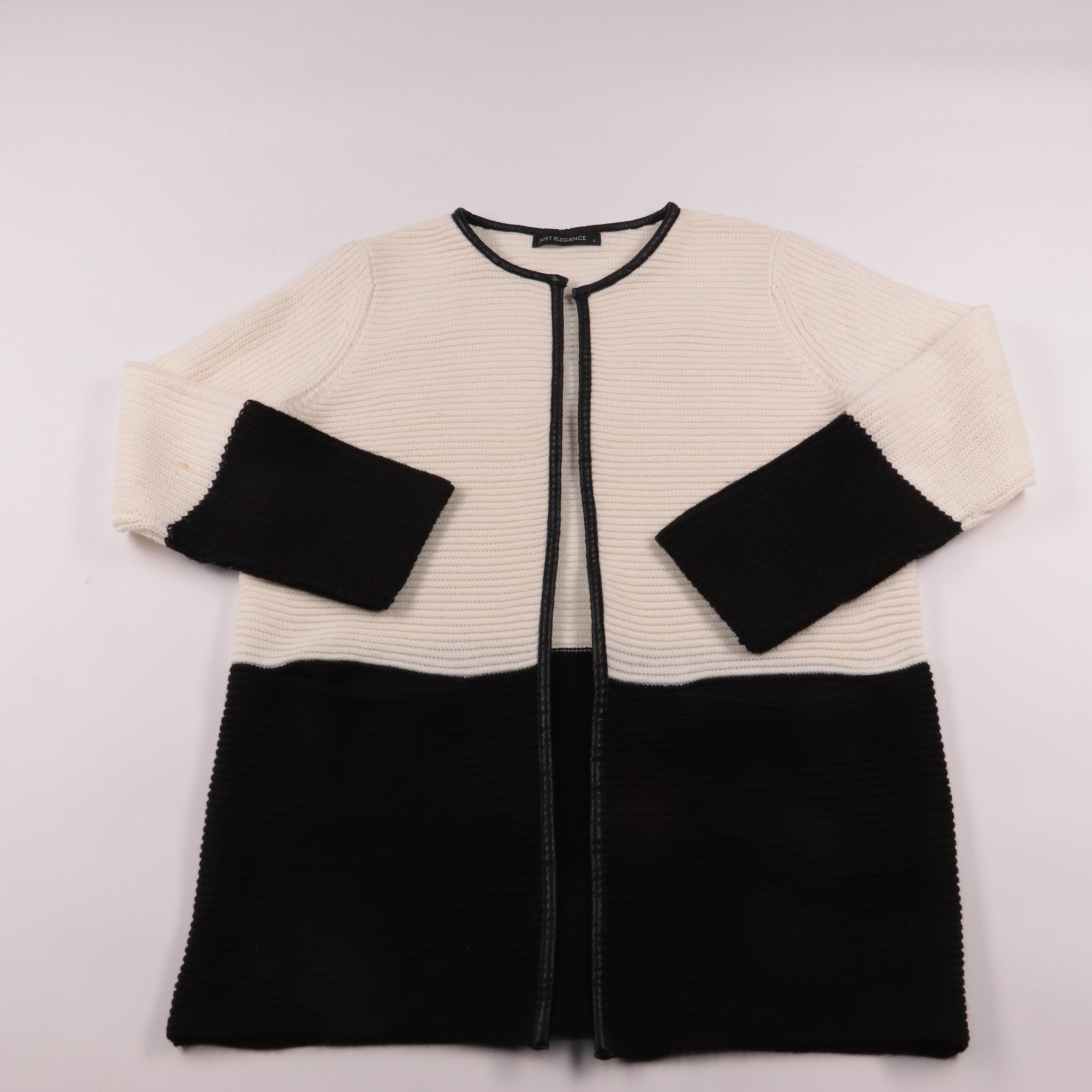 Вязаный кардиган Just Elegance в контрастном чёрно-белом дизайне с отделкой по краю. Подойдёт для офиса и повседневных образов в прохладную погоду, легко сочетается с платьями и брюками. Плотная фактура хорошо держит форму и комфортно носится поверх ба...