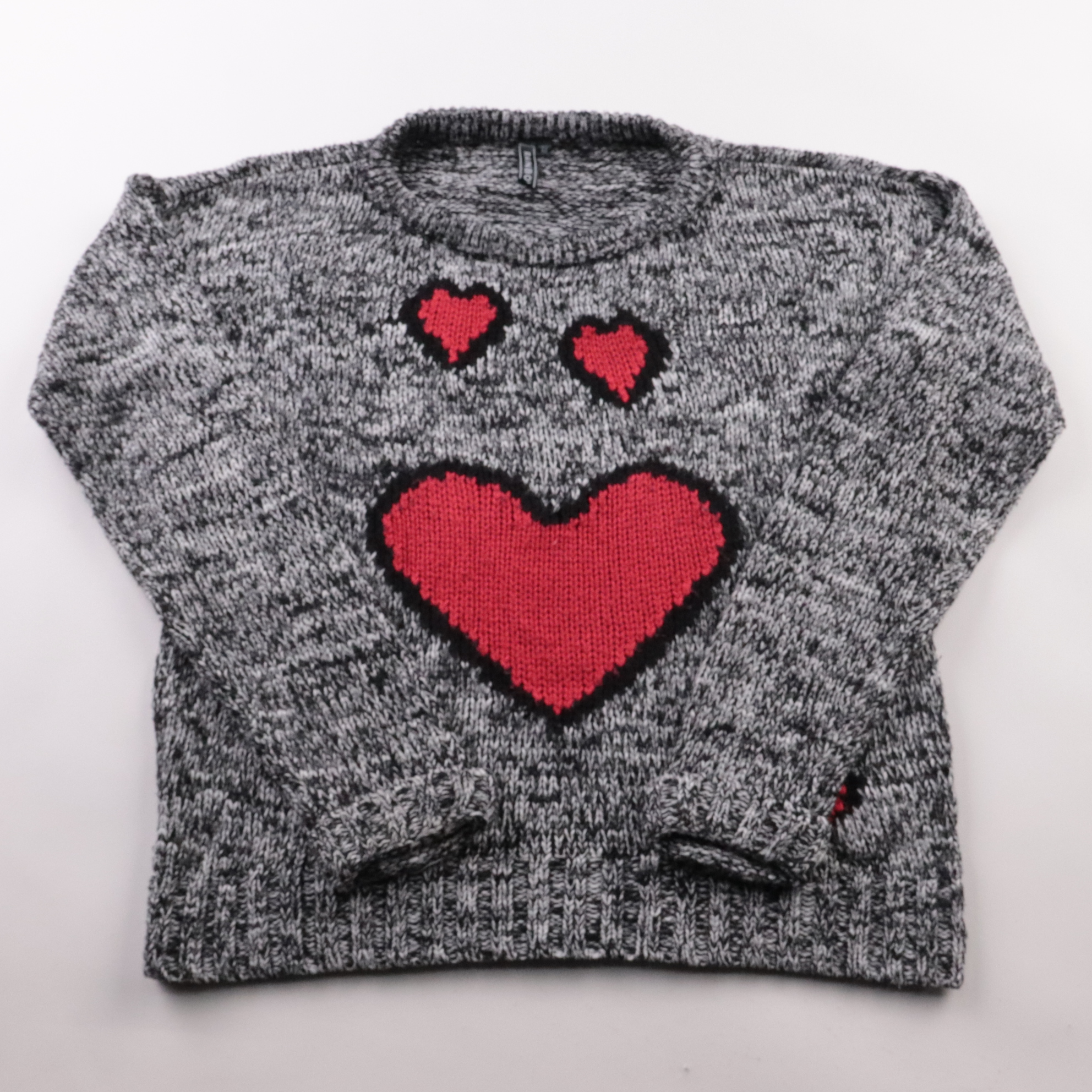 Вязаный свитер Rainbow серого меланжевого цвета с ярким рисунком сердечек на груди. Подойдёт для повседневных образов в прохладную погоду, хорошо смотрится с джинсами и юбками. Мягкий акрил в составе прост в уходе и быстро сохнет.