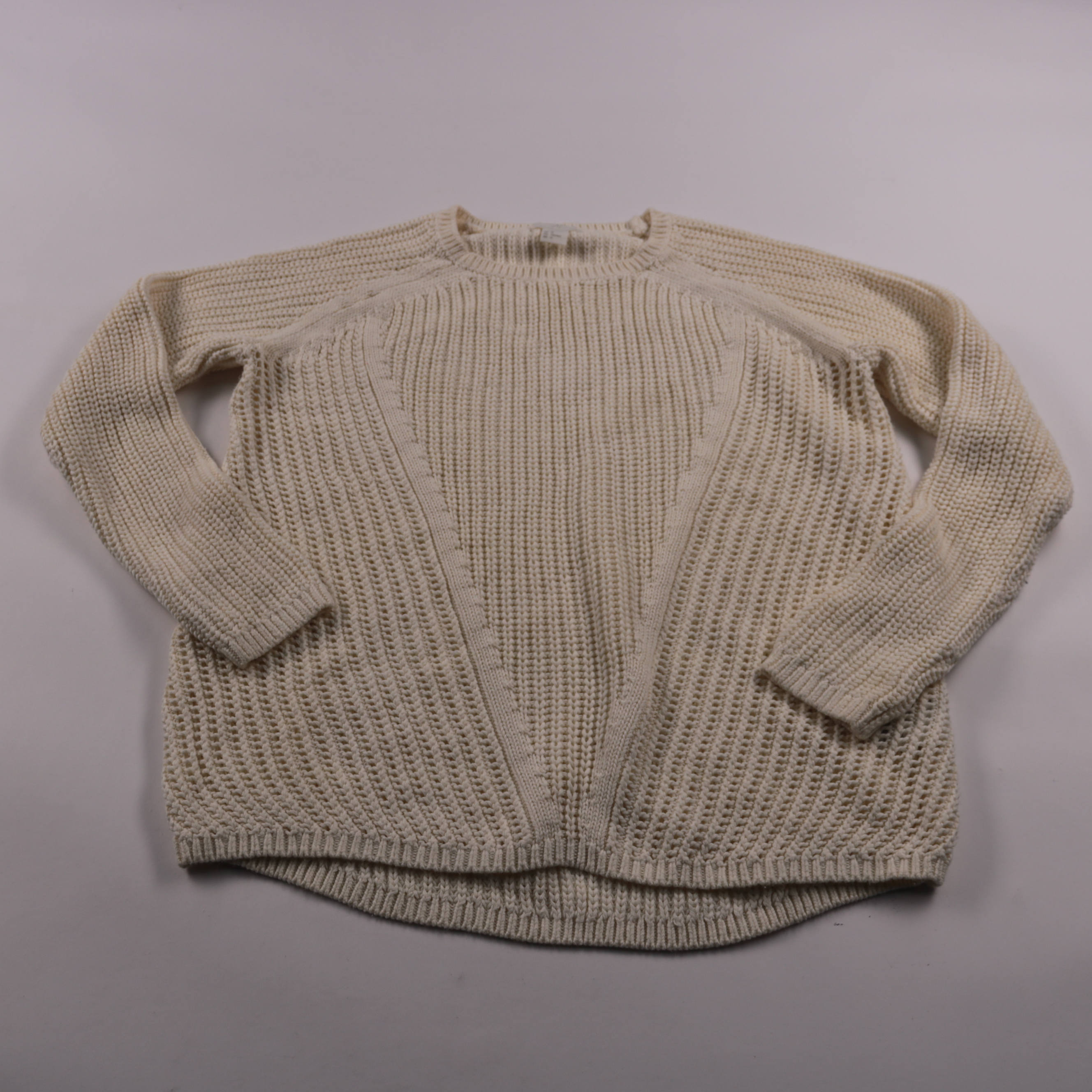 Вязаный свитер H&M молочного цвета с фактурной крупной вязкой и регланом. Подойдёт для повседневных образов в прохладную погоду, хорошо смотрится с джинсами и юбками. Мягкий смесовый состав и объёмный крой делают его удобным для многослойности.