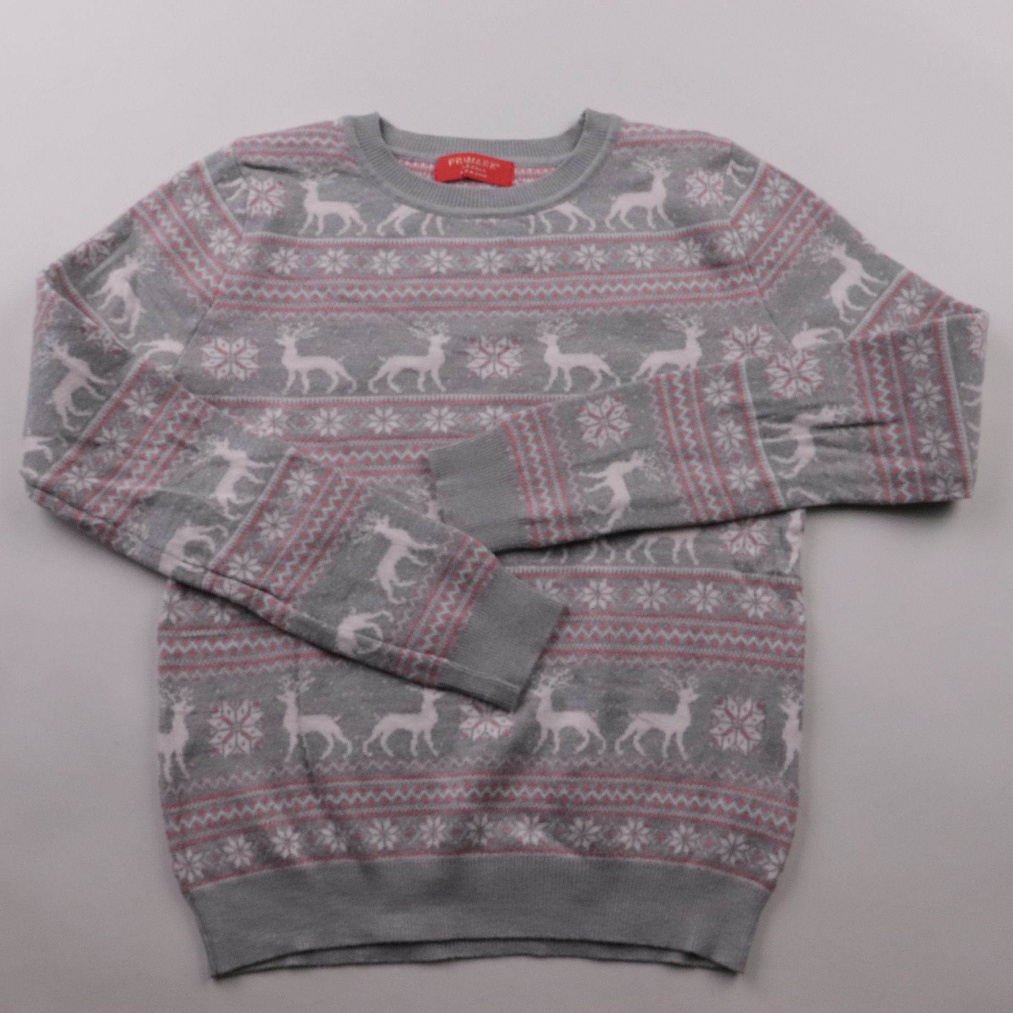 Свитер Primark серого цвета с зимним жаккардовым узором (оленя и снежинки). Подойдёт для холодного сезона, прогулок и уютных домашних образов. Мягкий трикотаж хорошо держит тепло и не требует сложного ухода.