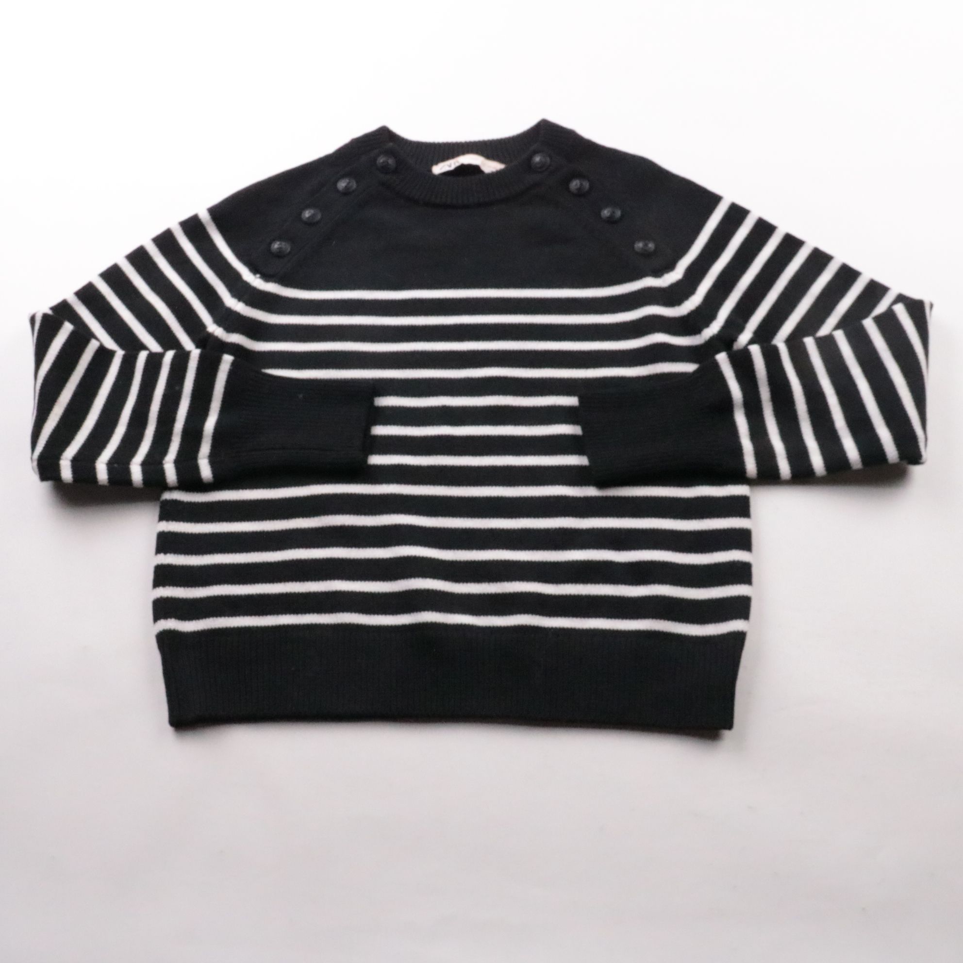 Женский джемпер Zara в черно-белую полоску, с декоративными пуговицами на плечах. Подойдет для повседневных образов с джинсами или юбкой в прохладную погоду. Плотная вязка хорошо держит форму и комфортна в носке.