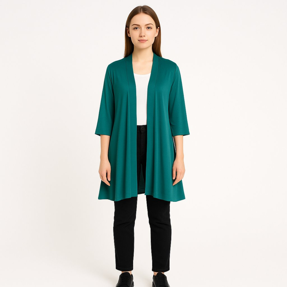 Женский кардиган K&D London из мягкой эластичной ткани, цвет тёмно-зелёный (бирюзовый оттенок), с открытым передом и рукавом 3/4. Подойдёт для офиса и повседневных образов, легко сочетается с топами и брюками. Практичен тем, что не мнётся и комфортно т...