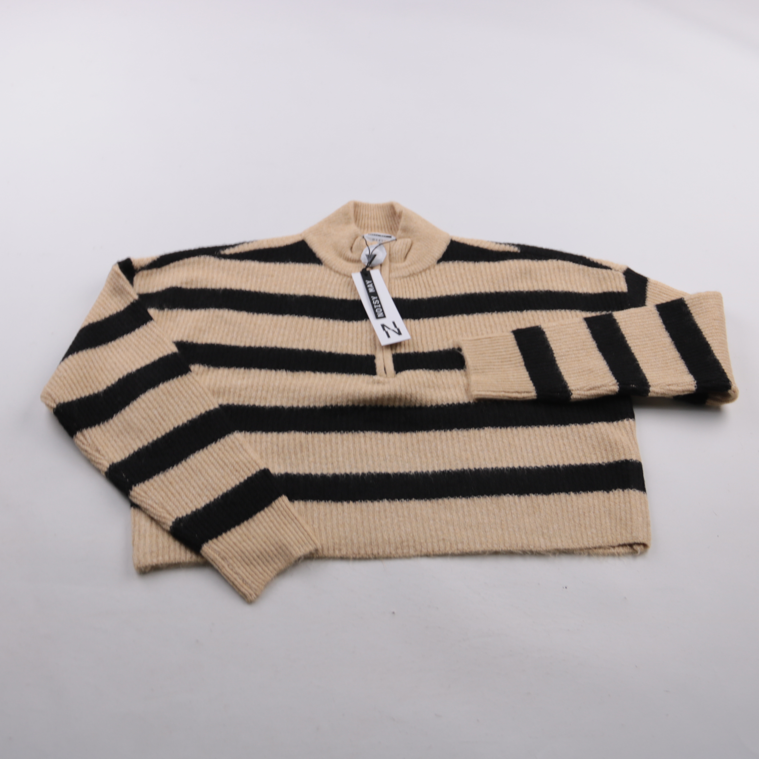 Полосатый вязаный джемпер Noisy May в бежево-чёрной гамме с короткой молнией у горла. Подойдёт для прохладной погоды и многослойных образов с джинсами или юбкой. Рельефная вязка хорошо держит форму и выглядит фактурно.
