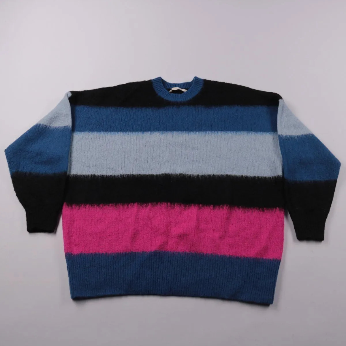Свитер в широкую полоску с мягкой пушистой фактурой, подойдёт для повседневной носки в прохладную погоду. Хорошо сочетается с джинсами и базовыми брюками и может носиться как верхний слой или под куртку. Трикотаж тёплый и приятный к телу, не требует сложного ухода.