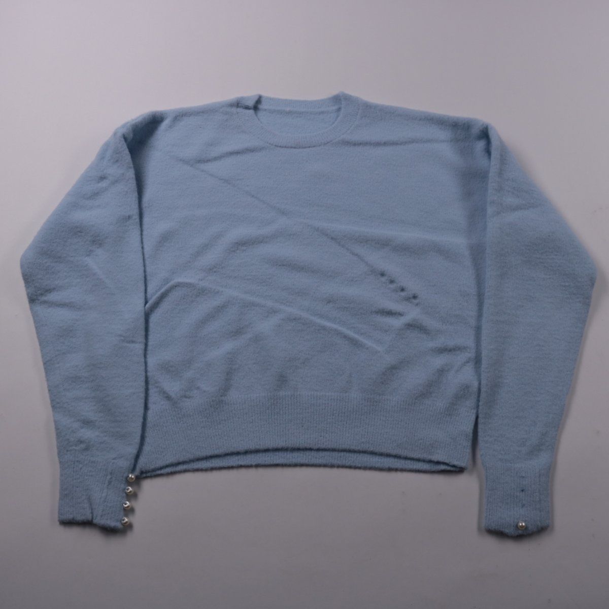 Женский джемпер мягкой фактуры голубого цвета с круглым вырезом и декоративными пуговицами на манжетах. Подойдёт для повседневных образов в прохладную погоду, легко сочетается с джинсами и юбками. Практичный вариант для многослойных комплектов под жакет или пальто.