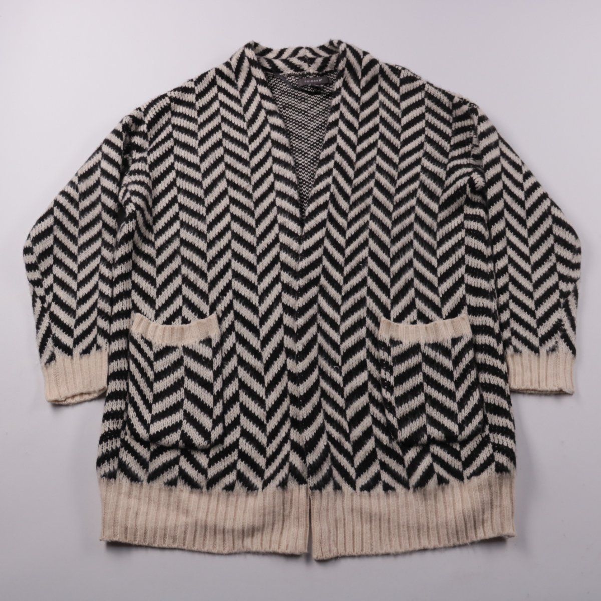 Вязаный кардиган Primark в чёрно-белом узоре «ёлочка», без застёжки, с накладными карманами и широкими манжетами. Подойдёт для повседневных образов в прохладную погоду, удобно накидывать поверх футболки или водолазки. Практичный плюс — мягкая плотная вязка и вместительные карманы.