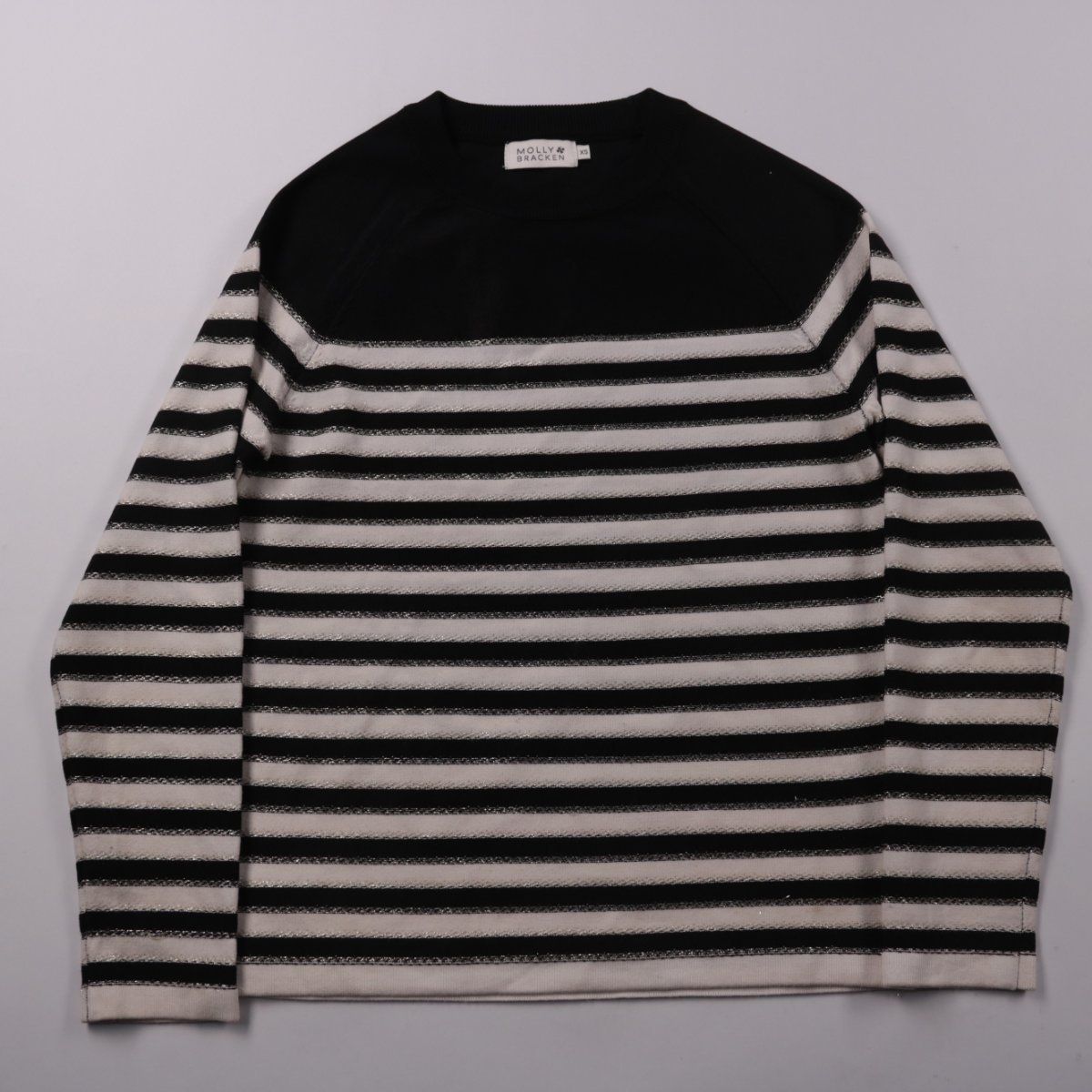 Джемпер Molly Bracken в чёрно-белую полоску с лаконичным круглым вырезом. Подойдёт для повседневных образов с джинсами или юбкой в прохладные дни. Практичный материал хорошо держит форму и не требует сложного ухода.