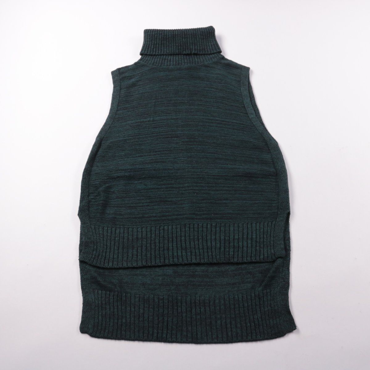 Вязаная водолазка без рукавов Banana Republic в тёмно-зелёном (меланжевом) цвете и с высоким горлом. Подойдёт для многослойных образов с рубашкой или лонгсливом в офис и на каждый день. Плотная вязка держит форму и аккуратно смотрится под жакетом.