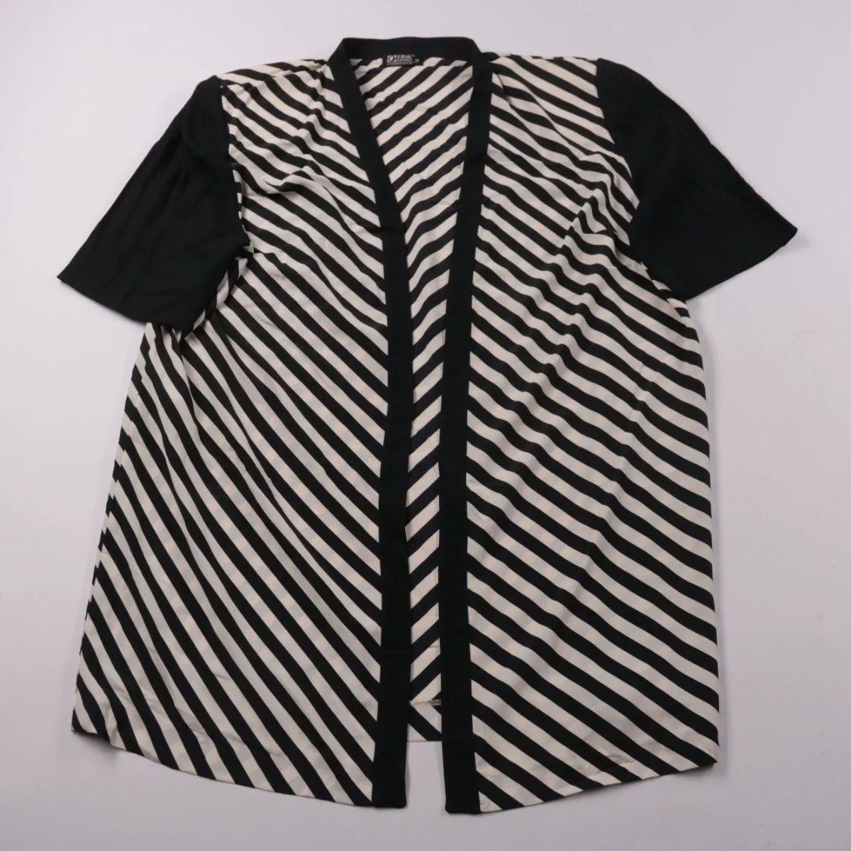 Женская кофта Fink Modell в чёрно-белую полоску с коротким рукавом и открытым передом. Подойдёт для офиса и повседневных образов, легко сочетается с однотонными брюками или юбкой. Практичная синтетическая ткань почти не мнётся и быстро сохнет.