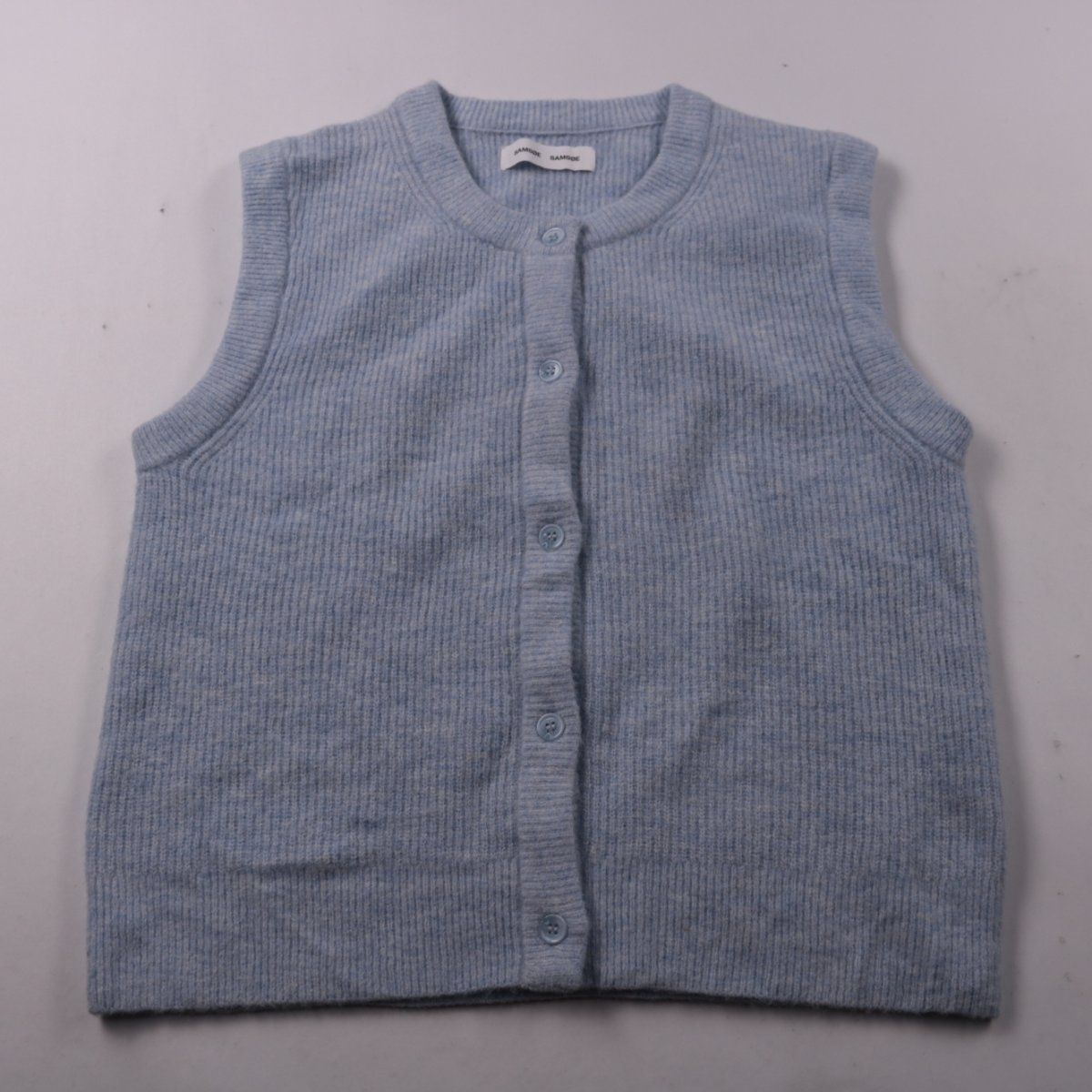 Трикотажный кардиган- жилет Samsøe Samsøe голубого цвета в рубчик, без рукавов, на пуговицах. Подойдёт для многослойных образов на прохладную погоду поверх лонгслива или рубашки. Эластичный состав хорошо тянется и комфортно садится по фигуре.