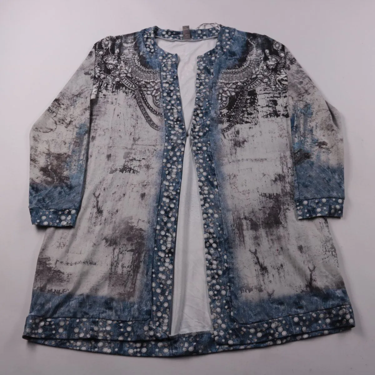 Кардиган Tredy с длинным силуэтом и открытым передом, выполнен в серо-сине-чёрном принте с контрастной отделкой по борту и низу. Подойдёт для многослойных повседневных образов и как лёгкий верхний слой в межсезонье. Практичный плюс — ткань с эластаном, лучше держит форму и комфортна в движении.