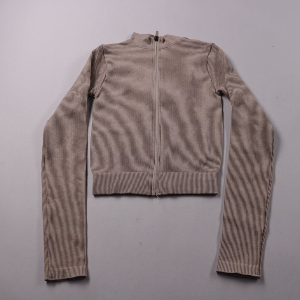 Рифлёная кофта на молнии с высоким воротником-стойкой, бренд не указан. Подойдёт для повседневных образов и как базовый слой в прохладную погоду. Эластичный материал хорошо тянется и плотно садится по фигуре.