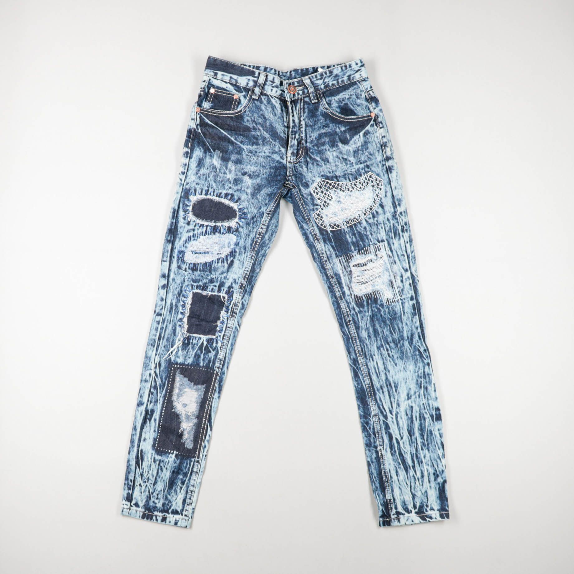 Женские джинсы Fashion из денима с выраженным кислотным варёным эффектом и декоративными нашивками/потёртостями. Подойдут для повседневных образов в стиле streetwear с кедами или ботинками. Плотный материал хорошо держит форму и не требует сложного ухода.