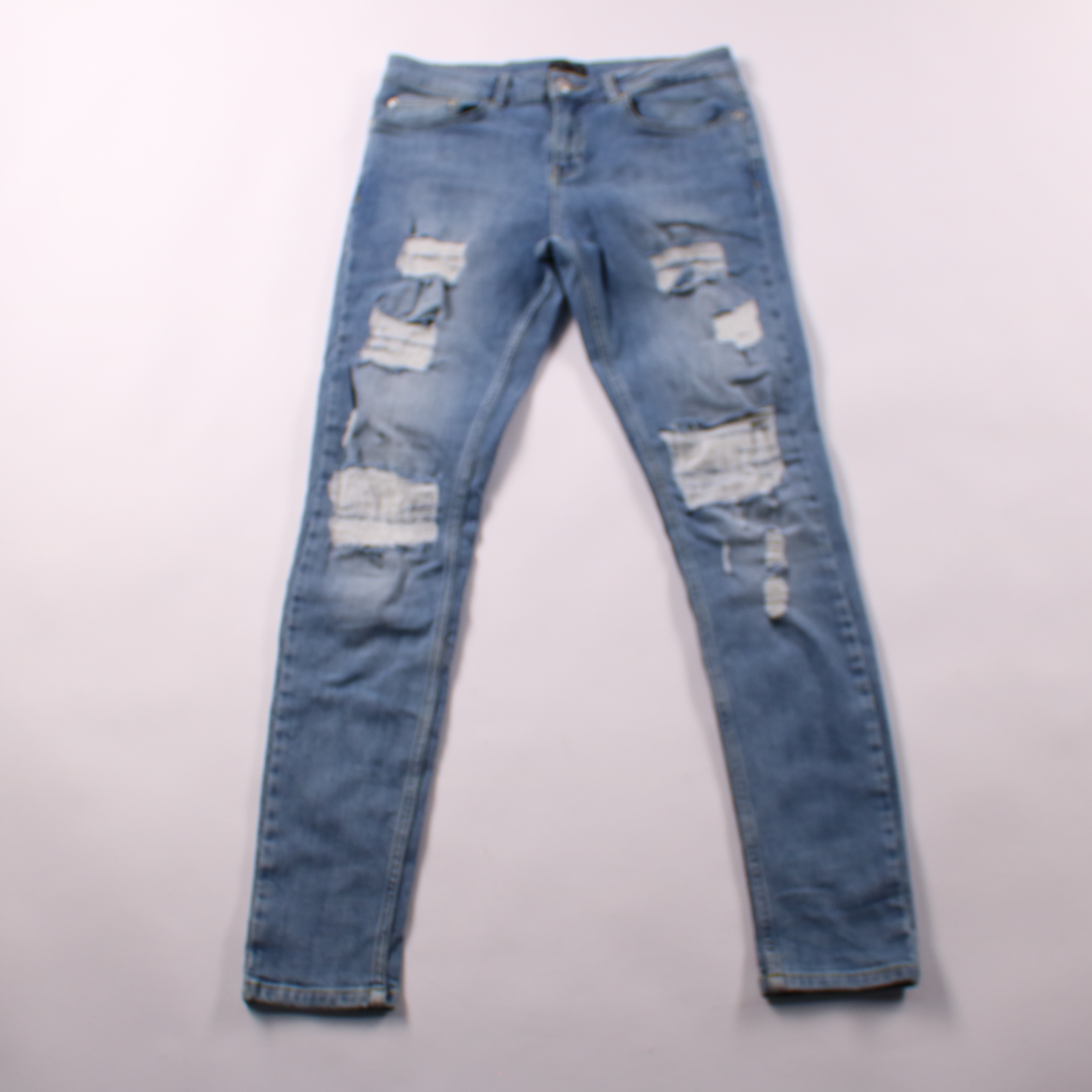 Женские джинсы Pegador из голубого денима с декоративными потертостями и нашивками. Подойдут для повседневных образов в уличном стиле с кедами или ботинками. Плотный хлопок хорошо держит форму и комфортен в носке.