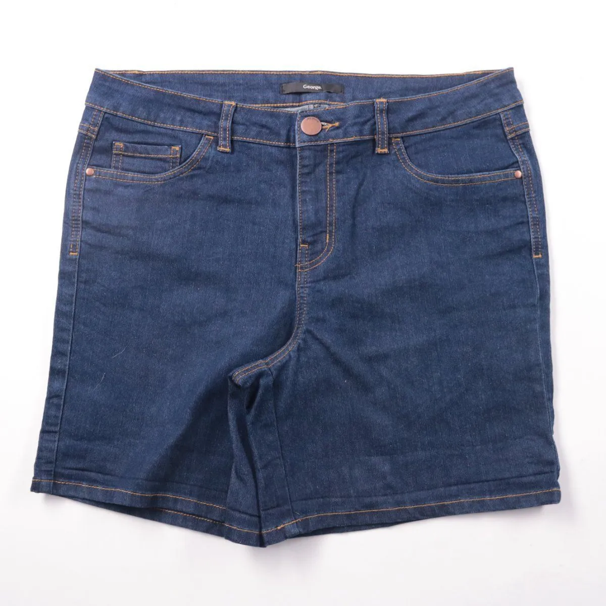 Джинсовые шорты George из тёмно-синего денима с классическими 5 карманами и застёжкой на молнию и пуговицу. Подойдут для повседневных летних образов и прогулок. Небольшая добавка эластана делает посадку более комфортной и не сковывает движения.