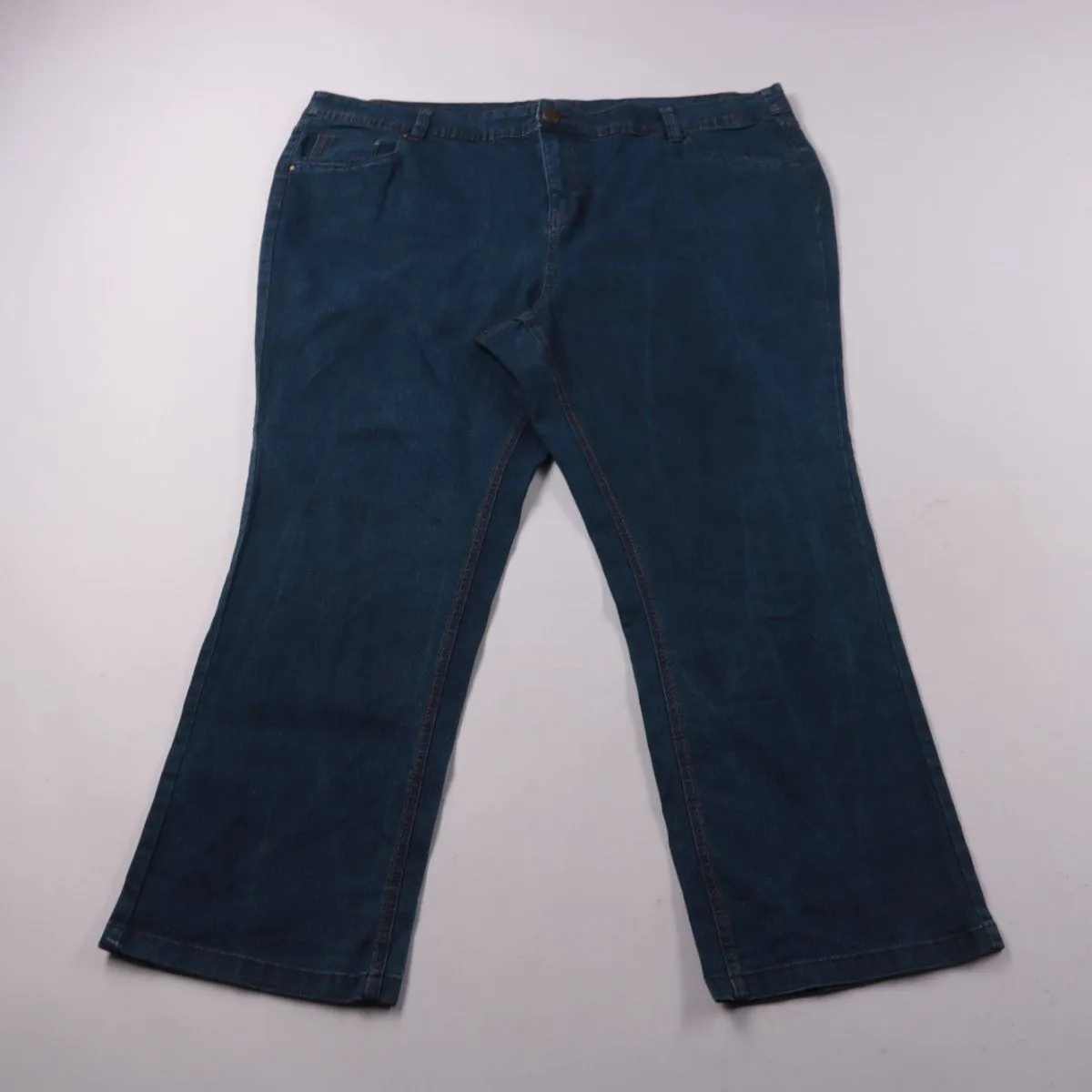 Женские джинсы из денима тёмно-синего цвета, без видимого бренда на фото. Модель с лёгким клёшем подойдёт для повседневной носки и базовых образов. Плотная джинса хорошо держит форму и практична в уходе.