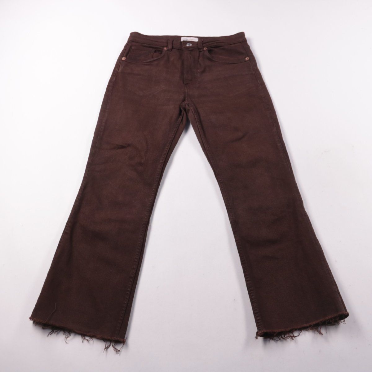 Джинсы Zara коричневого цвета с клёш от колена и необработанным низом. Подойдут для повседневных образов с кедами или ботильонами в прохладную погоду. Плотный деним хорошо держит форму.