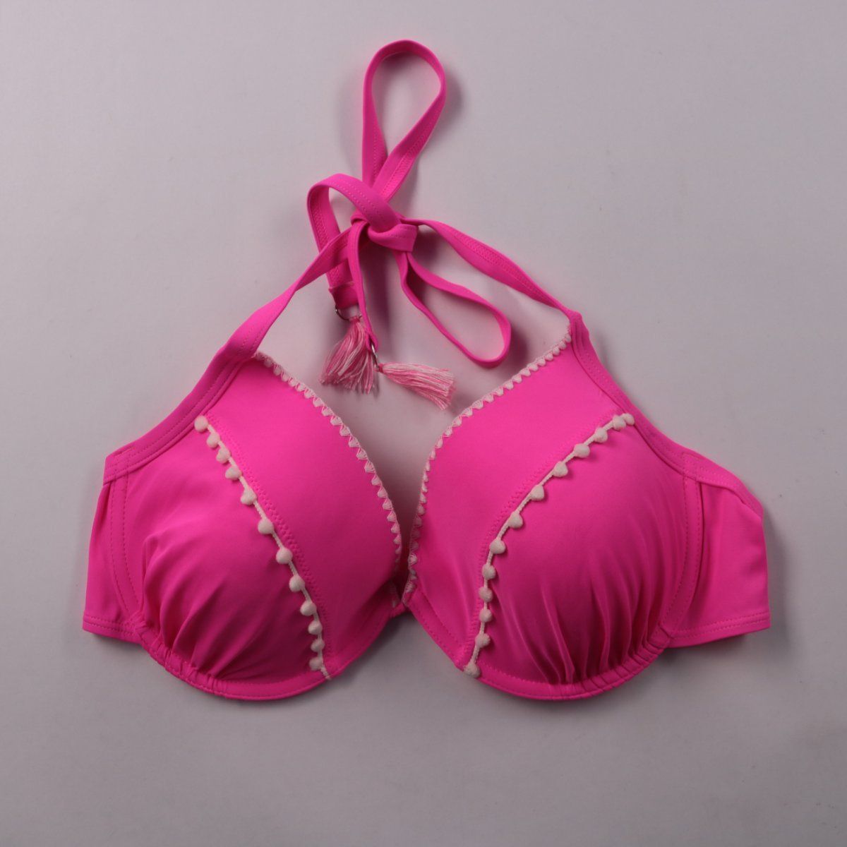 Женский лиф купальника Matalan ярко-розового цвета с отделкой из маленьких помпонов по краю. Подойдёт для пляжа и бассейна, завязки на шее позволяют удобно отрегулировать посадку. Формованные чашки помогают держать форму и поддерживают грудь.
