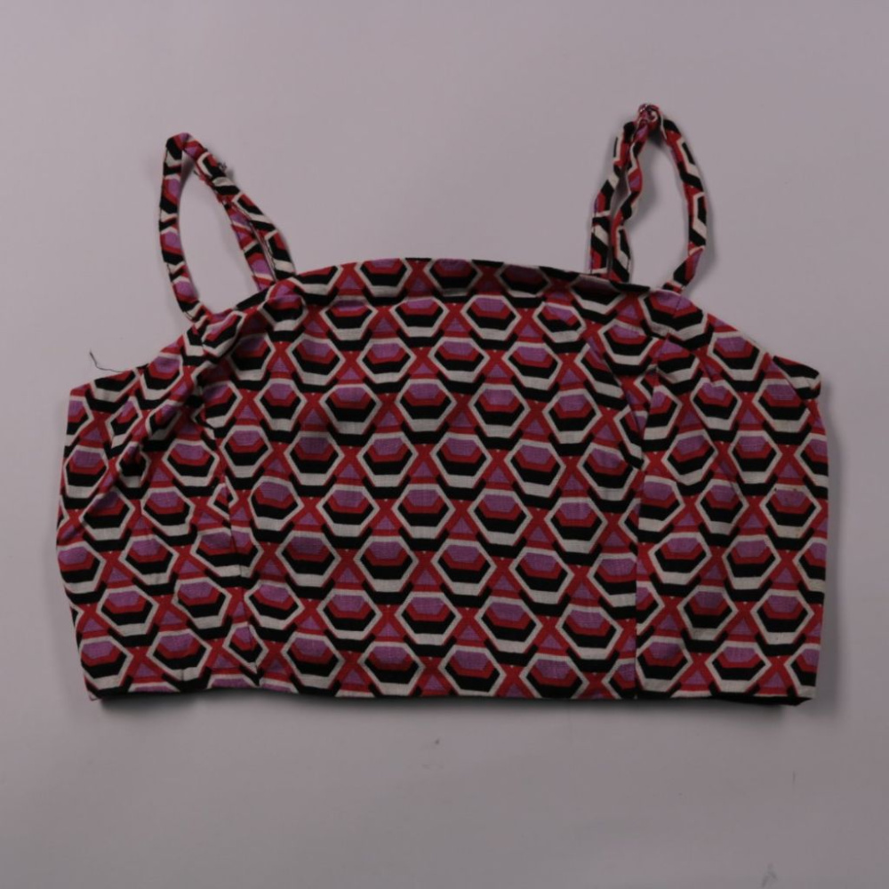 Топ-бра Stradivarius на тонких бретелях с геометрическим принтом в красно-розовых тонах. Подойдёт для лета, отпуска и повседневных образов, можно носить как бельевой топ или как верх. Эластичная спинка хорошо садится по фигуре и не сковывает движения.