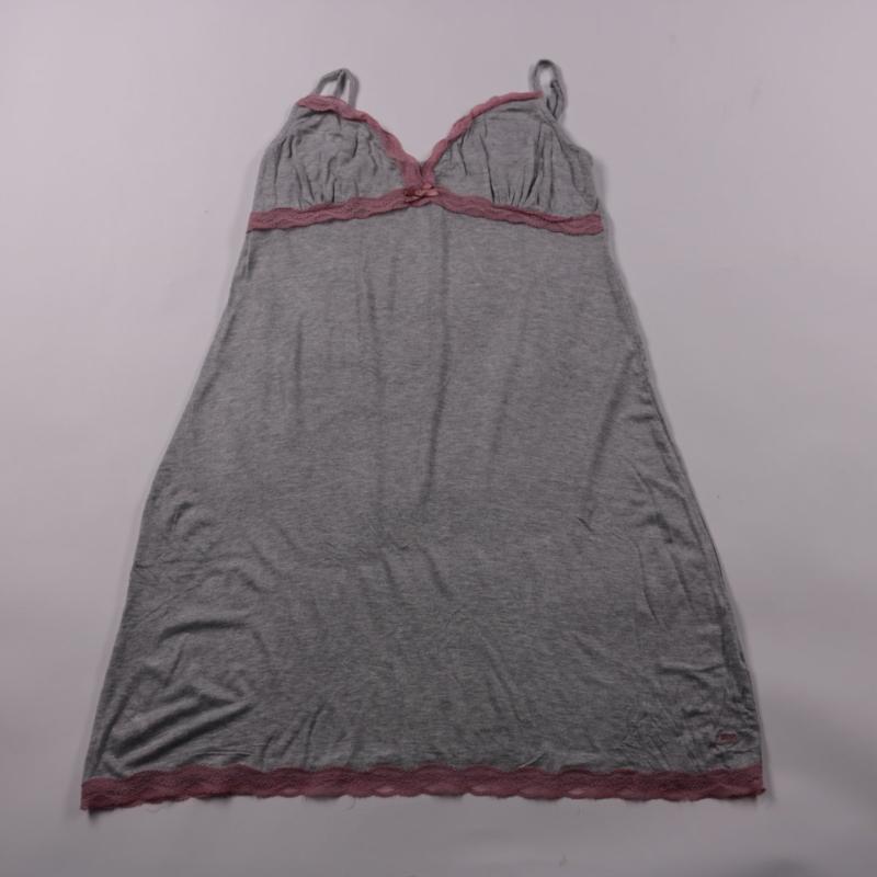 Женская ночная сорочка Etam серого цвета с розовой кружевной отделкой и тонкими бретелями. Подойдёт для дома и сна, мягкий трикотаж комфортно сидит и не сковывает движения. Практична в уходе и легко сочетается с домашней одеждой.